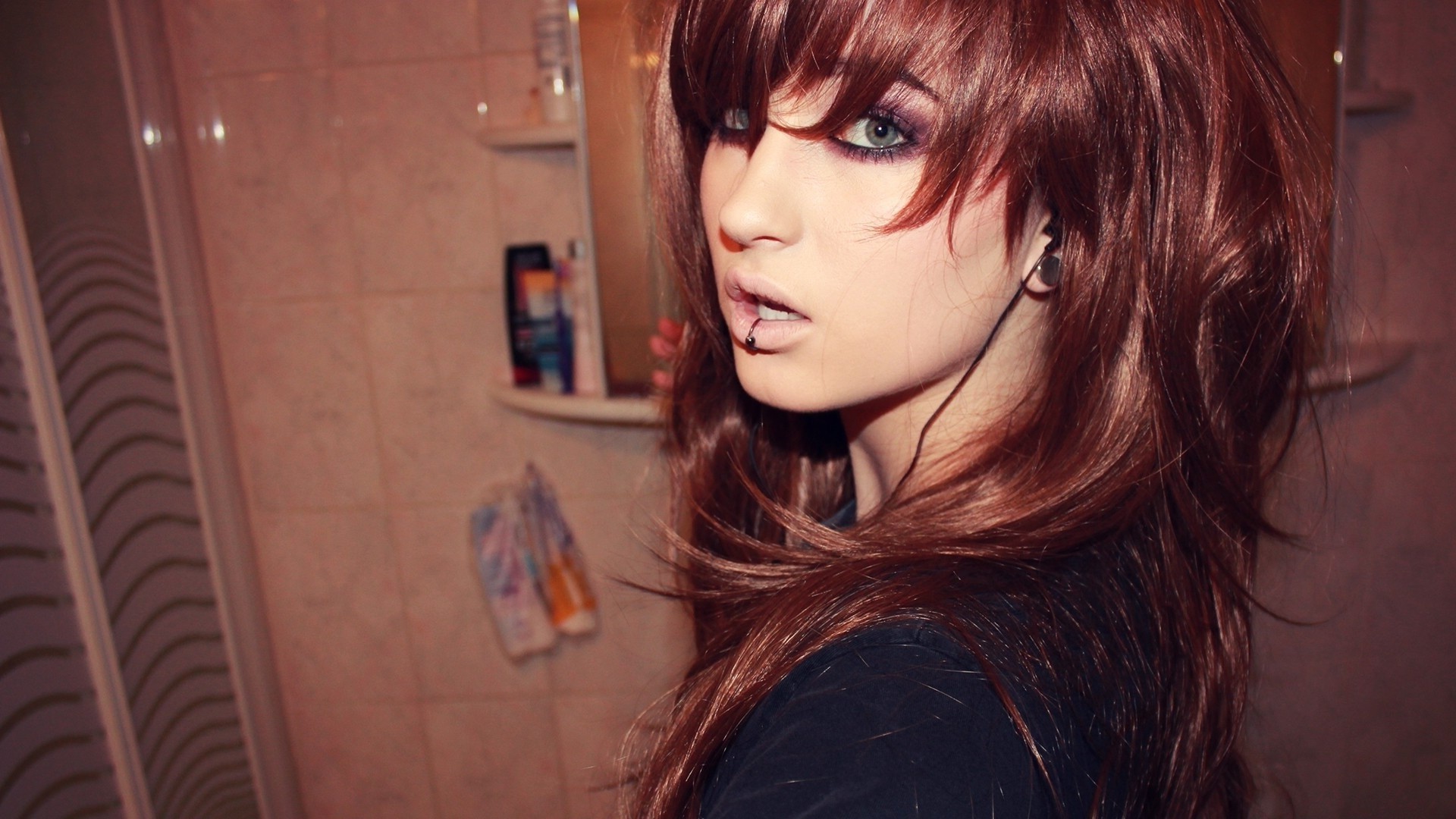 Description: A woman with long hair standing in a bathroom with a shower stall in the background and a sink in the foreground.