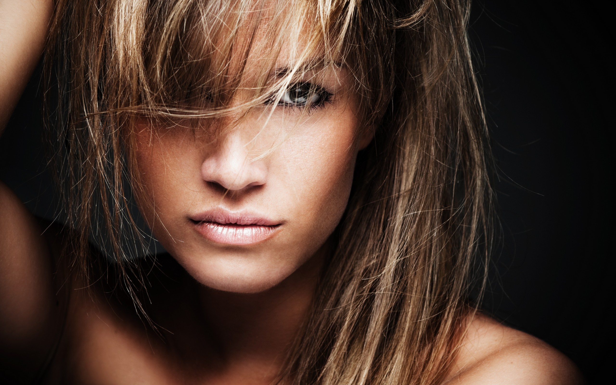Description: A woman with long hair and a black background is posing for a picture with her hair blowing in the wind.