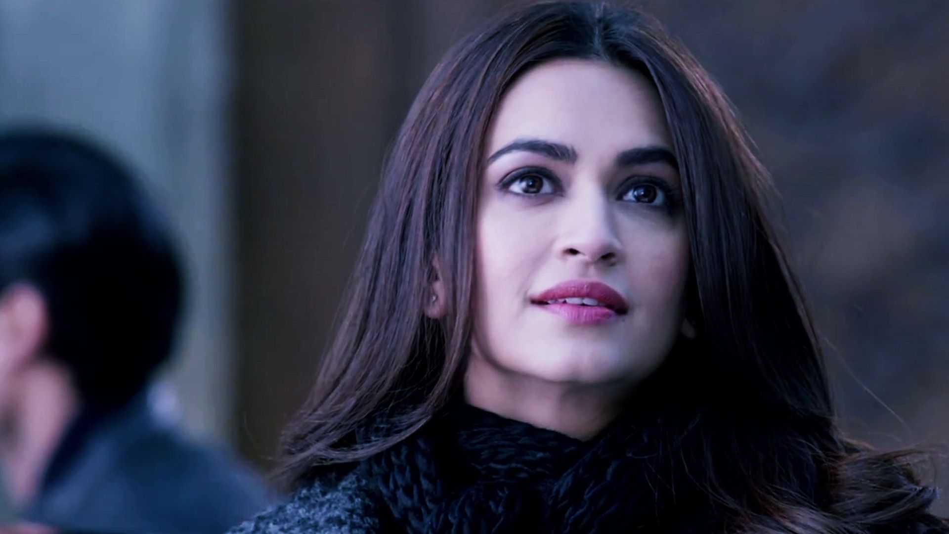 Description: A woman with long hair and a black coat looking off to the side with a man in the background.