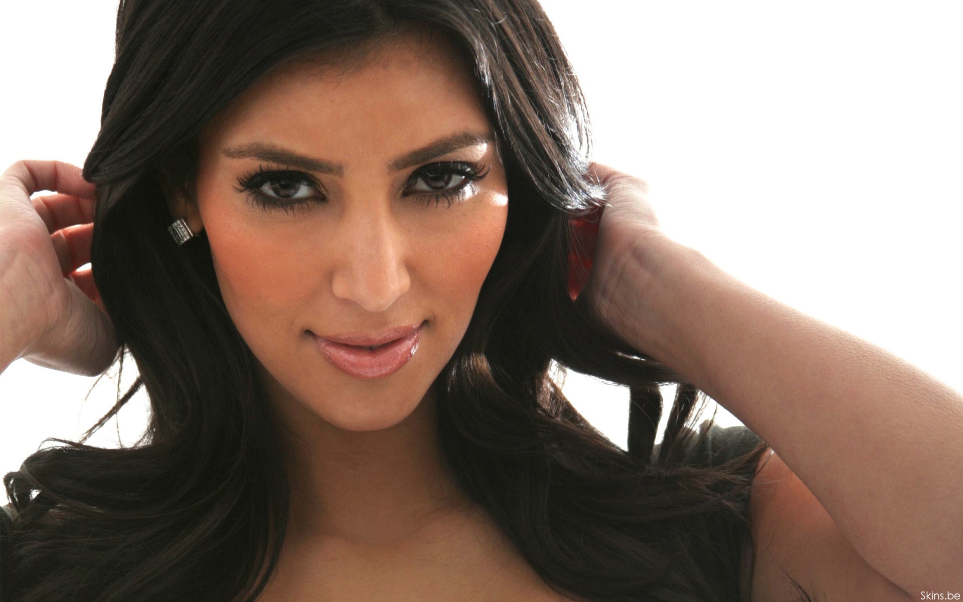 Description: A woman with long hair and a black dress is posing for a picture with her hair in a ponytail.