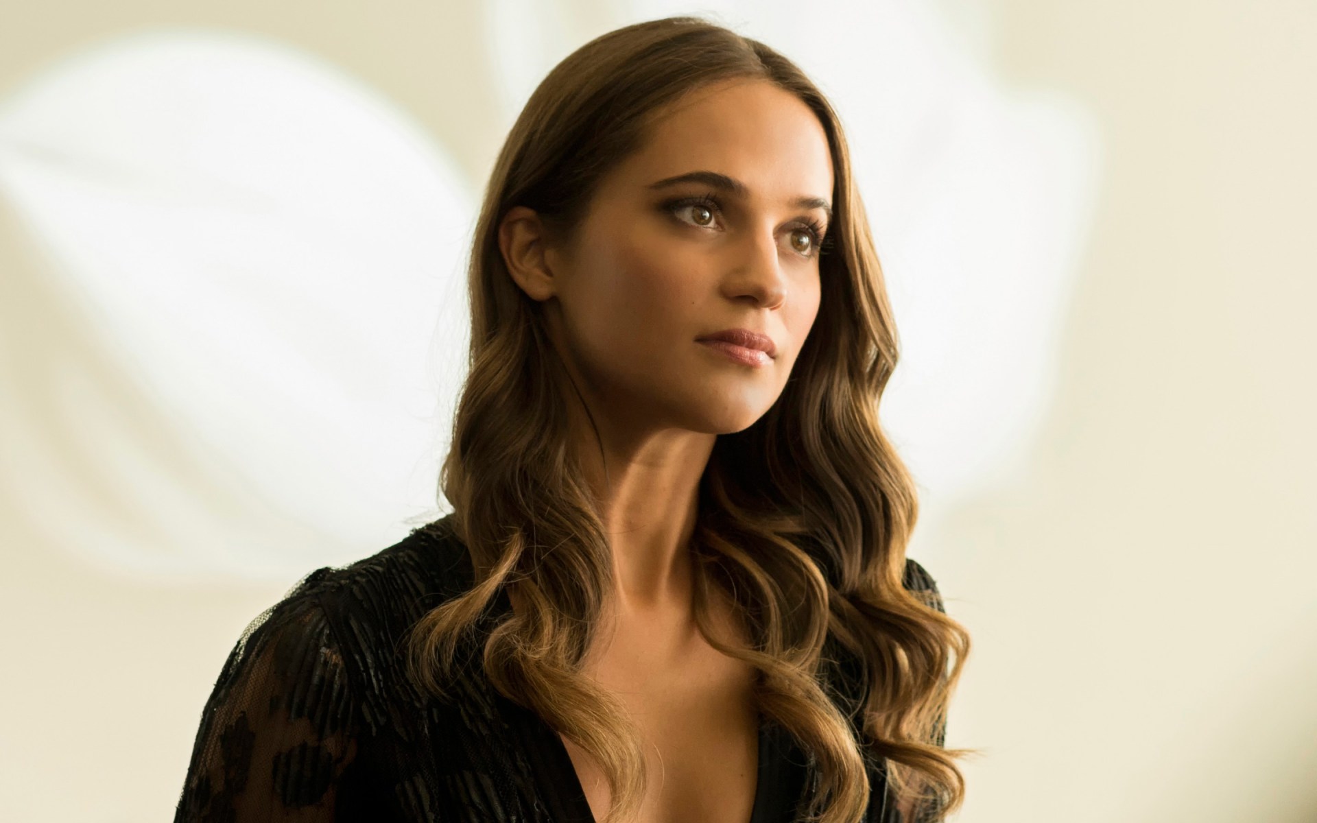 Description: A woman with long hair and a black dress is looking at the camera with a serious look on her face.