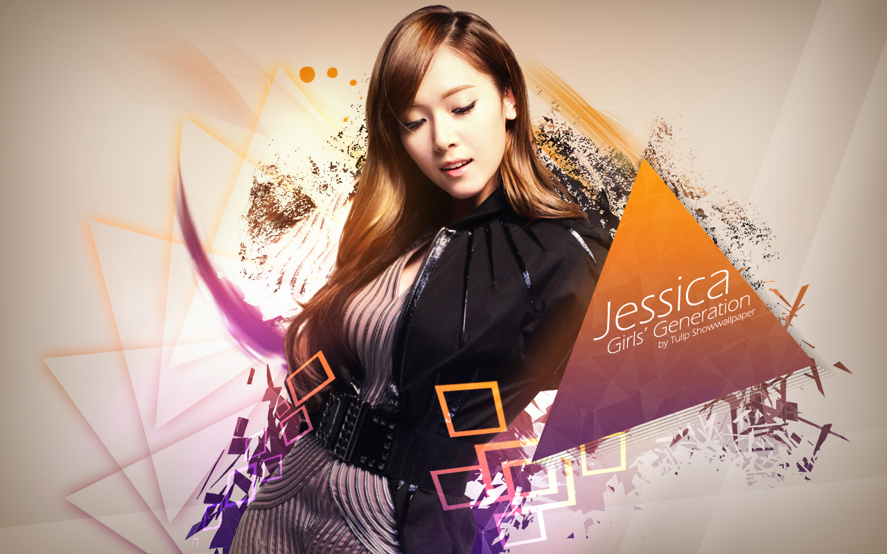 Description: A woman with long hair and a black jacket on holding a orange and white sign with a geometric design.