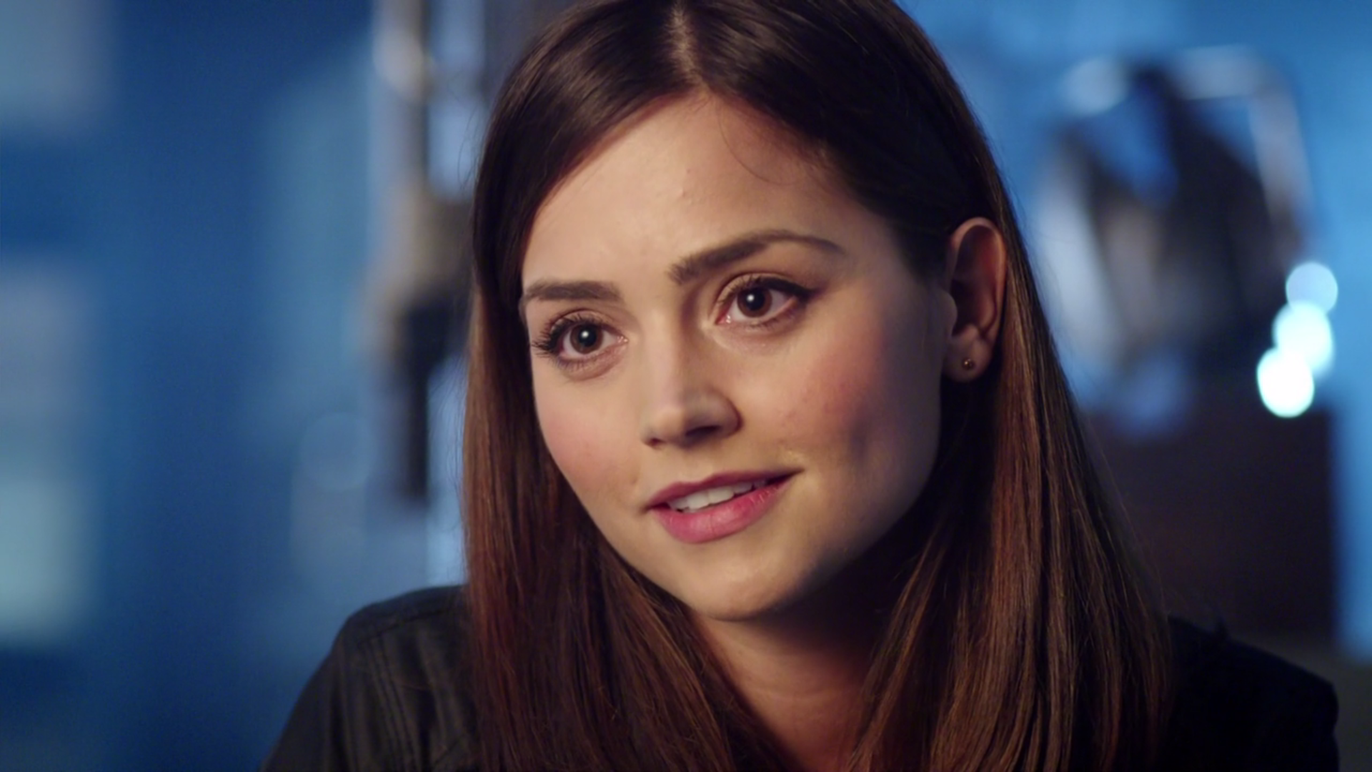Description: A woman with long hair and a black shirt is looking at the camera and smiling at the camera with a serious look on her face.