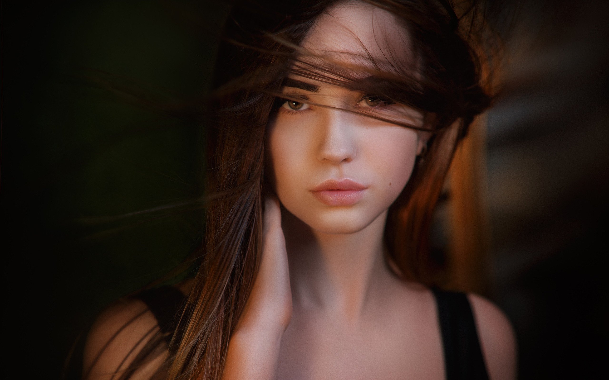 Description: A woman with long hair and a black top is posing for a picture with her hair blowing in the wind.
