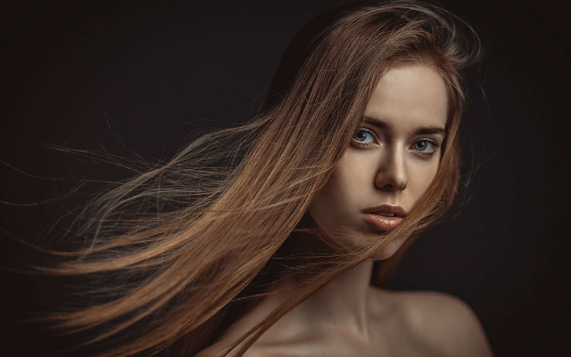Description: A woman with long hair blowing in the wind with a black background and a black background behind her is a portrait of a woman with long hair.