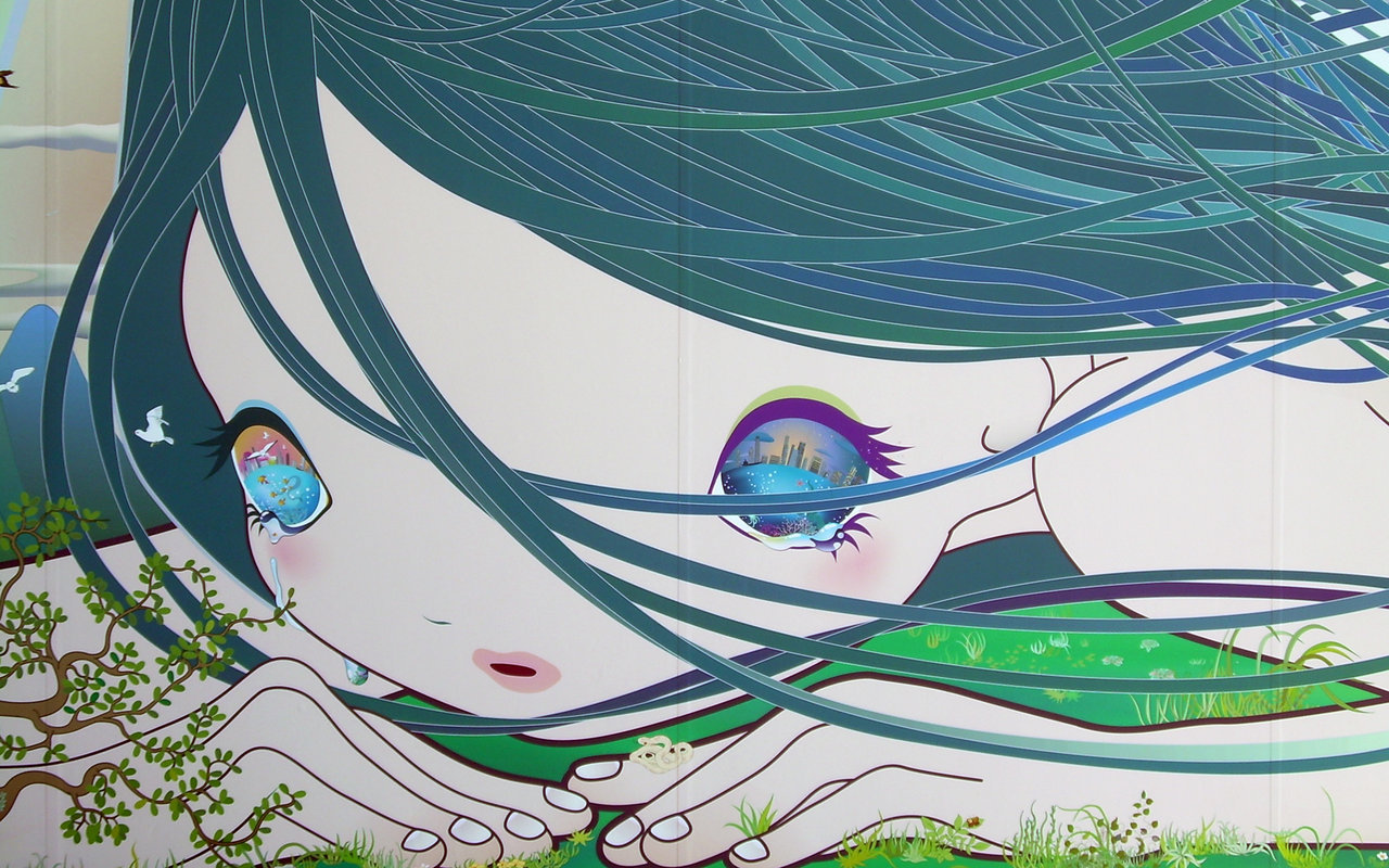 Description: A painting of a woman with long hair and blue eyes with a bird flying above her head and a tree with a bird on it.