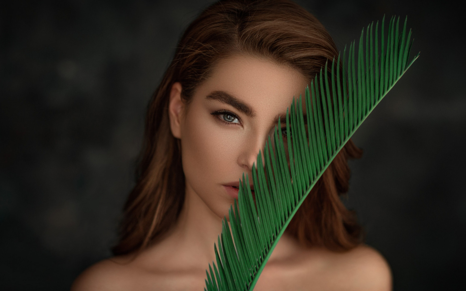 Description: A woman with long hair and blue eyes is holding a green leaf in front of her face and looking at the camera.