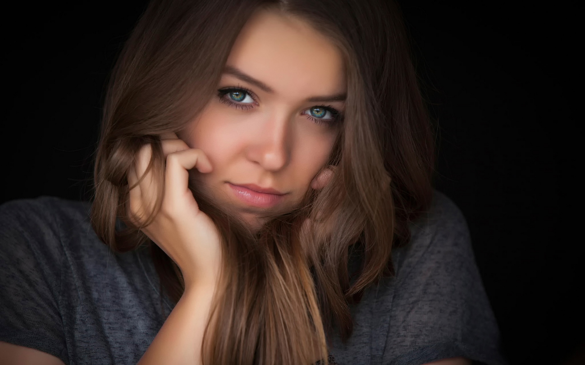 Description: A woman with long hair and blue eyes posing for a picture with her hands on her chin and her hand on her cheek.