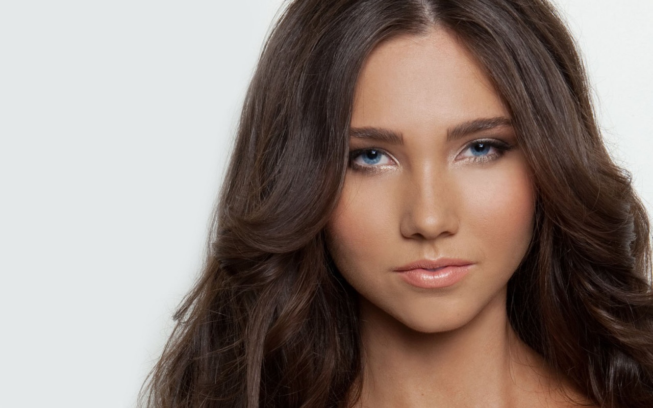 Description: A woman with long hair and blue eyes posing for a picture with her hair blowing in the wind and her eyes slightly closed.