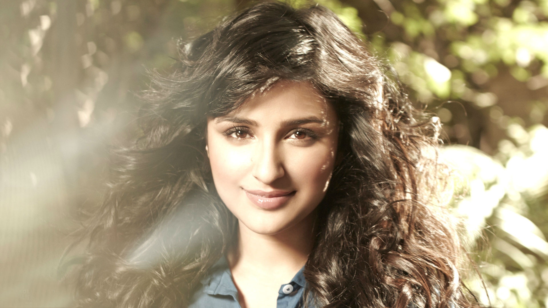 Description: A woman with long hair and a blue shirt smiling at the camera with trees in the background and sunlight streaming through her hair.