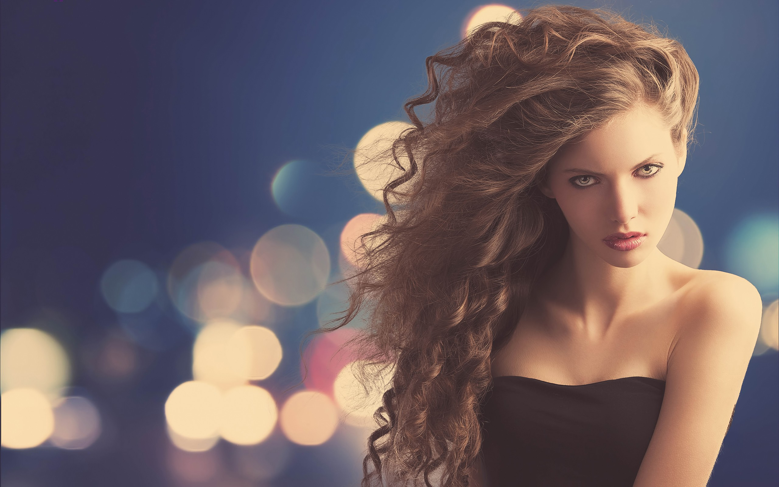 Description: A woman with long hair standing in front of a blurry background of lights and boke of lights.