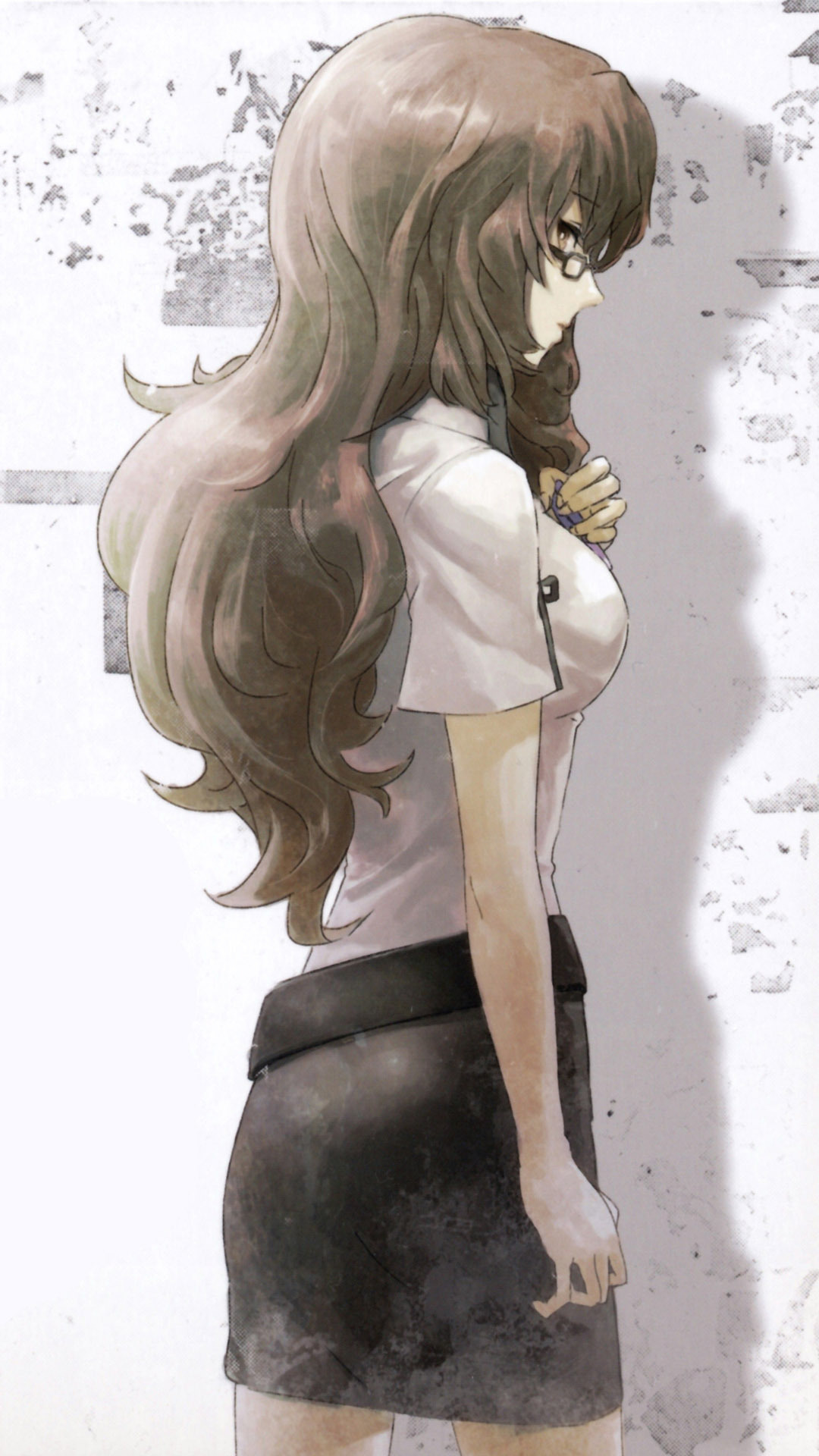 Description: A woman with long hair standing in front of a wall with a brick wall behind her and a knife in her hand.