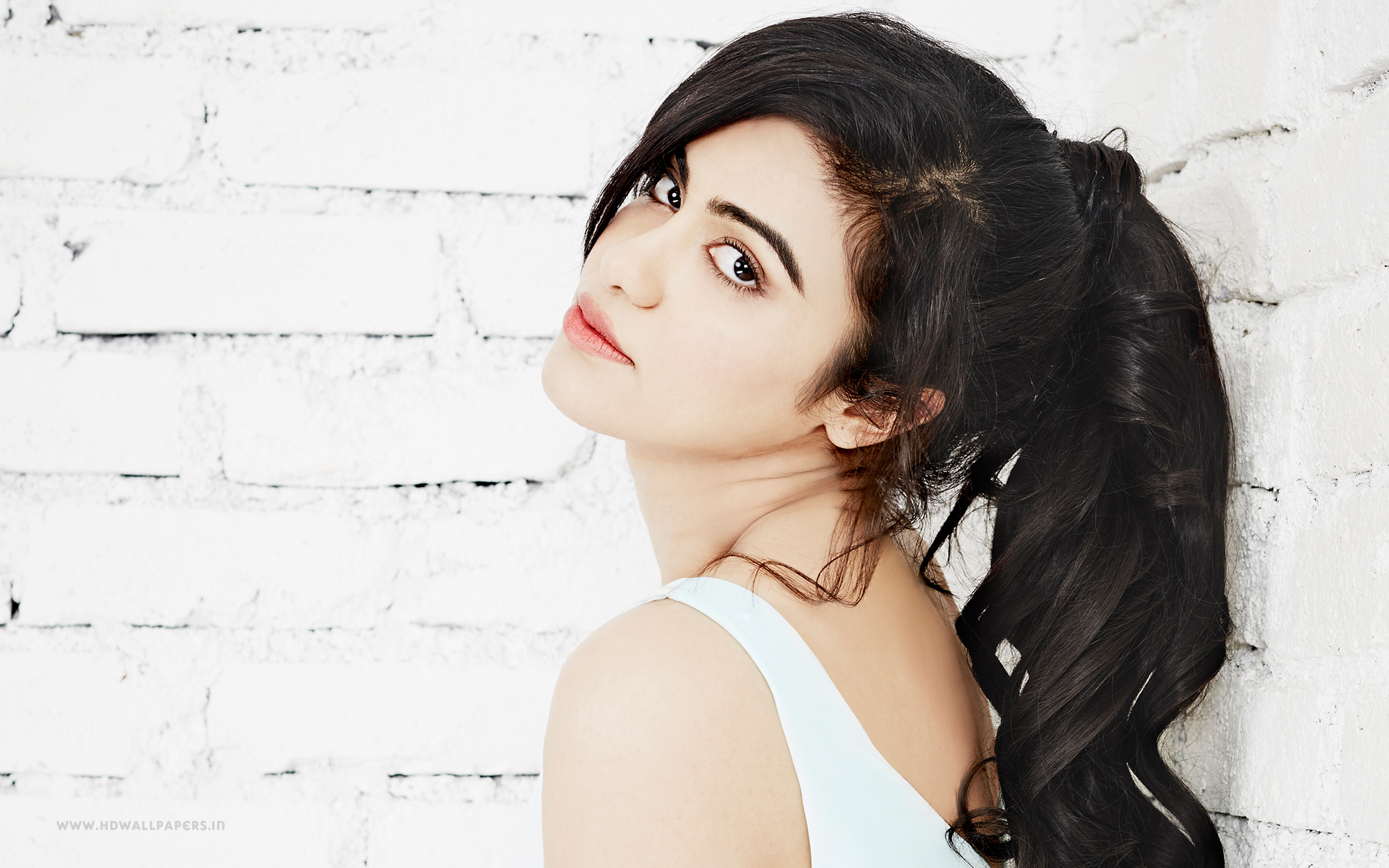 Description: A woman with long hair standing in front of a brick wall with her eyes closed and looking up at something.