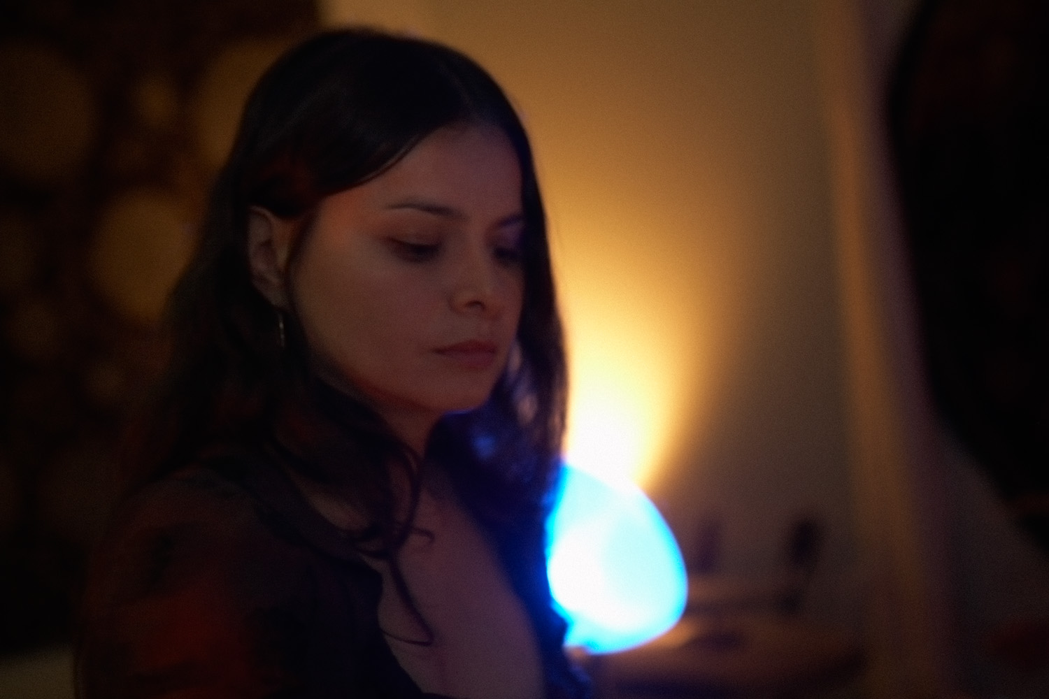 Description: A woman with long hair looking at her cell phone in a dark room with a light on the wall.