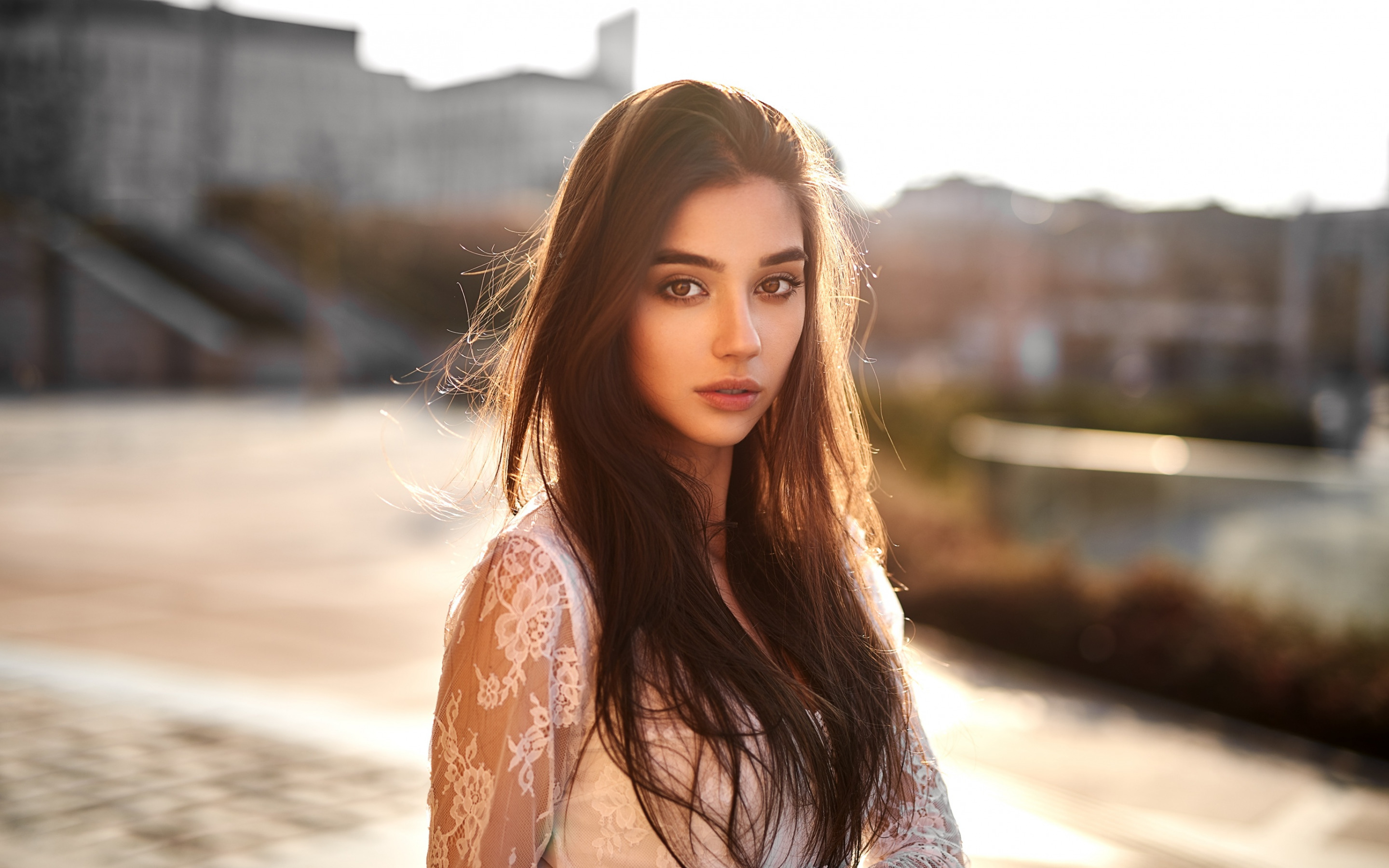 Description: A woman with long hair standing on a sidewalk in a city setting with a building in the background and a street light in the foreground.