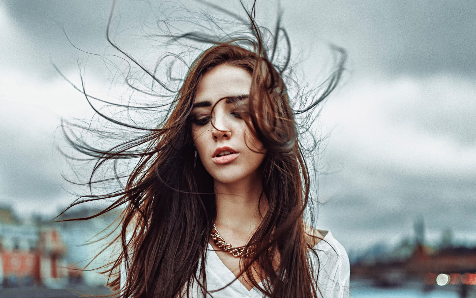 Description: A woman with long hair standing in front of a cloudy sky with her hair blowing in the wind and a city in the background.