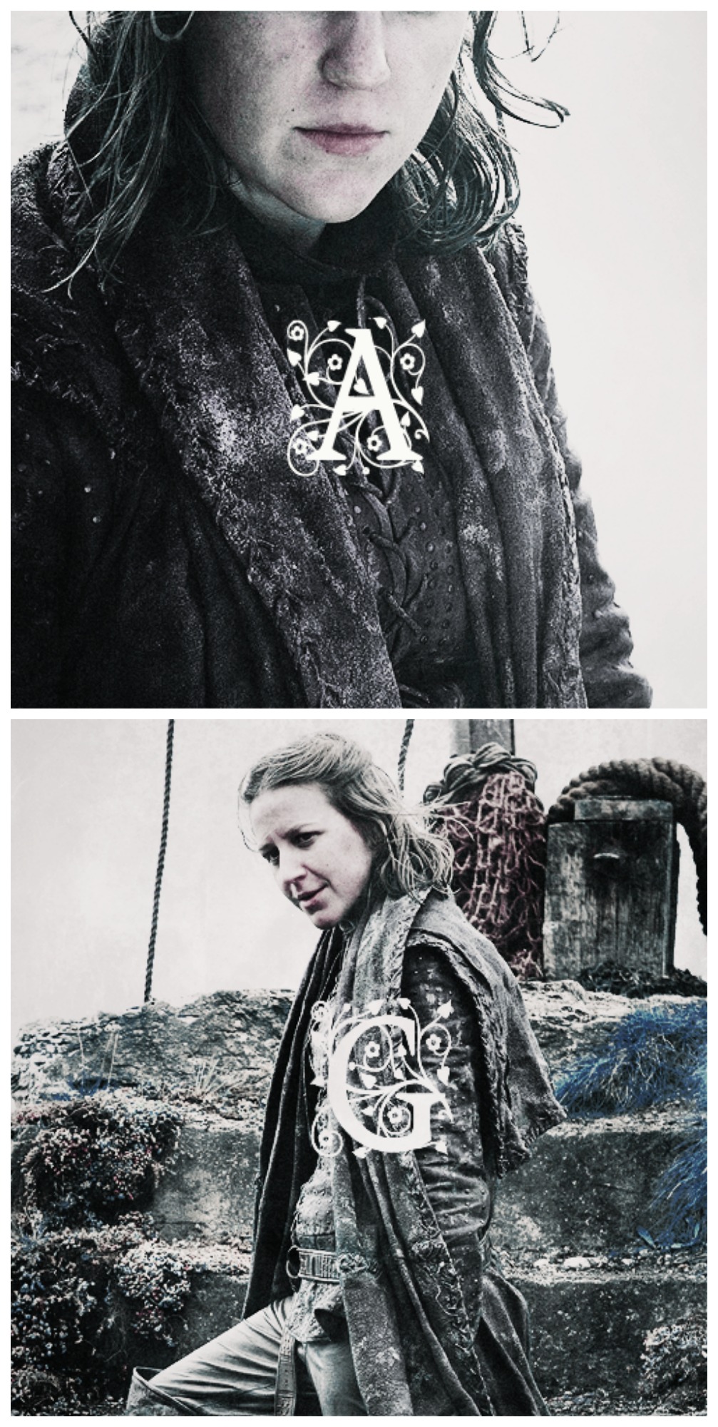 Description: A woman with long hair and a coat on and a picture of a woman with long hair and a coat on.