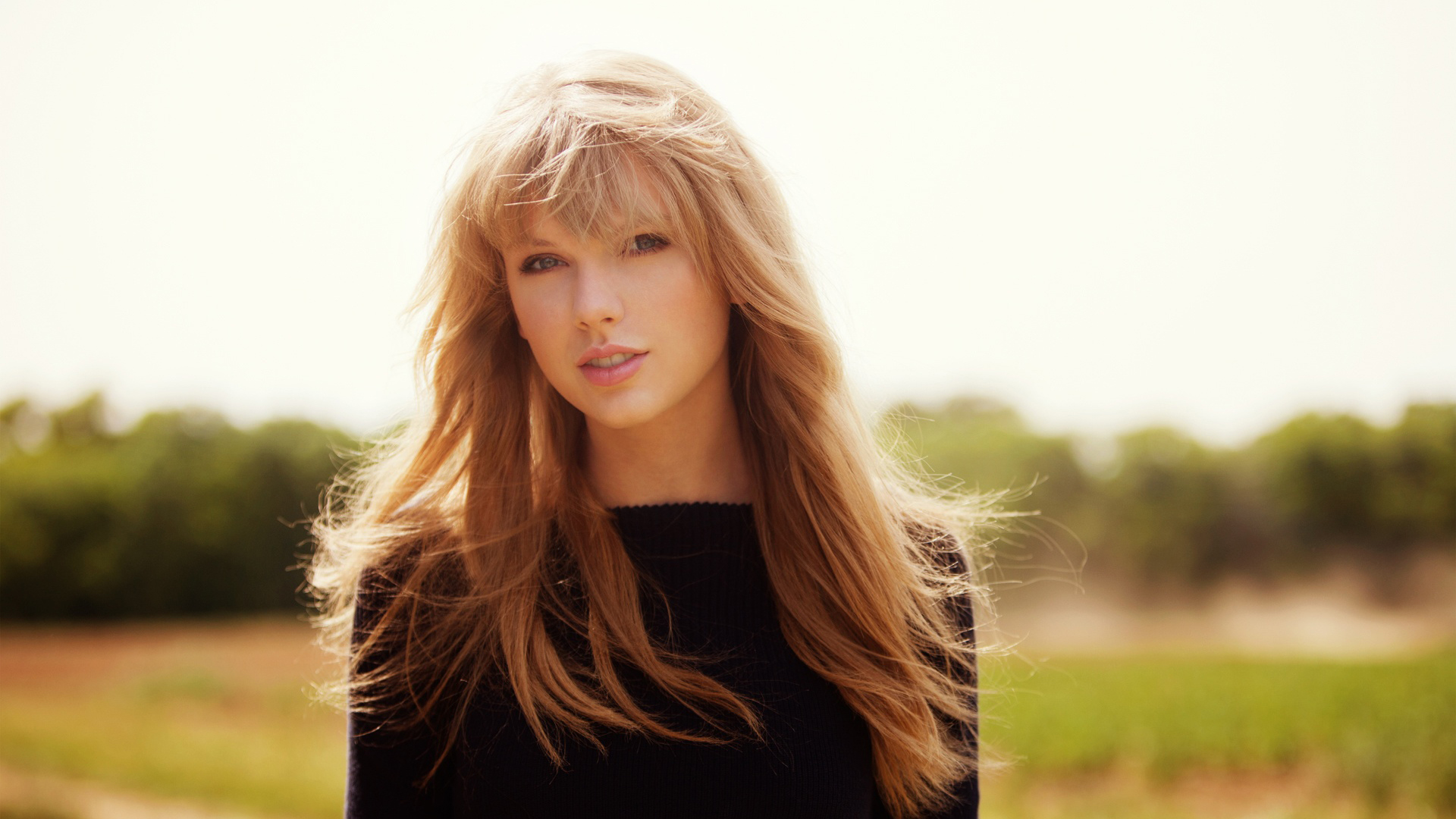 Description: A woman with long hair standing in a field of grass and trees in the background.