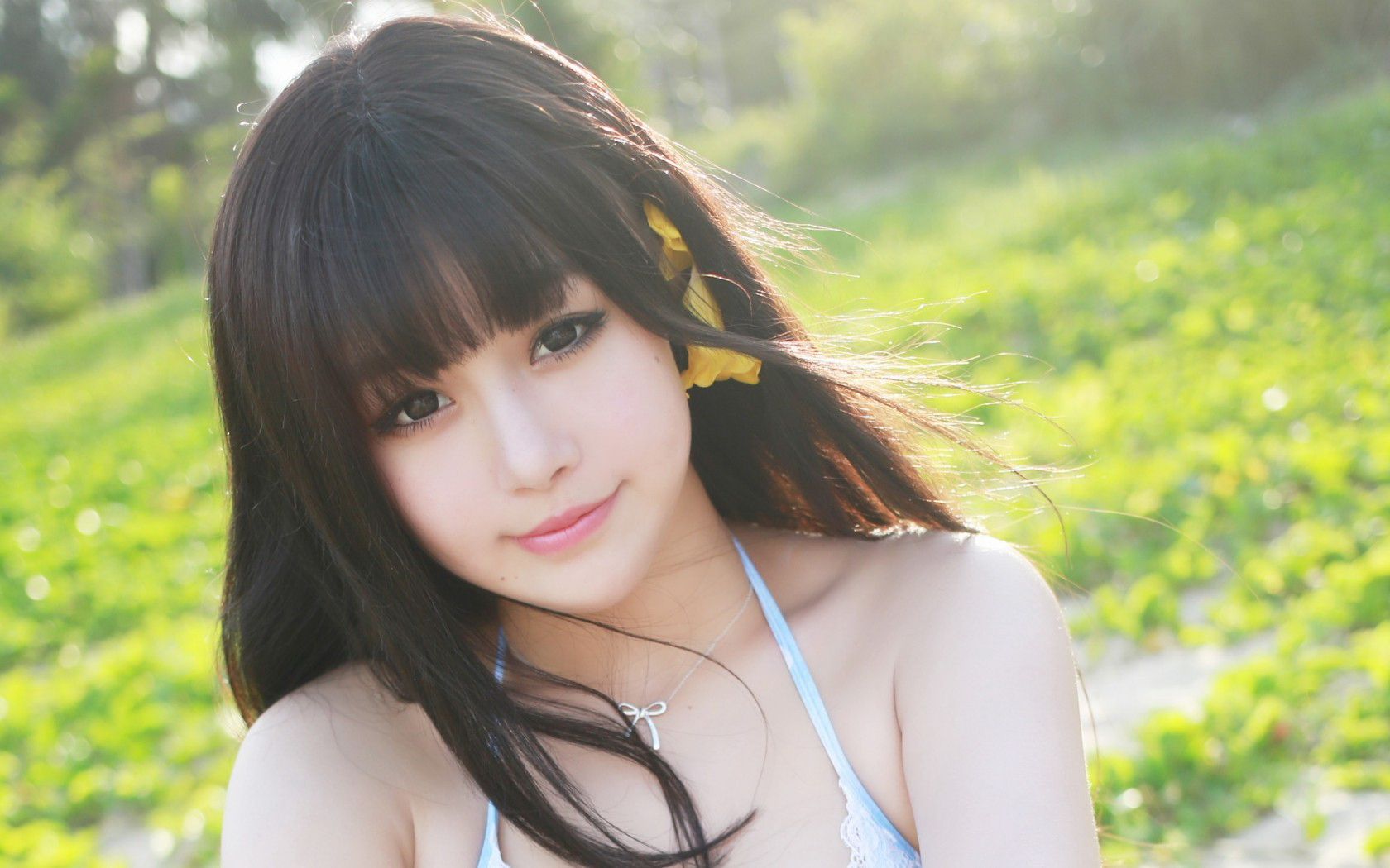 Description: A woman with long hair and a flower in her hair is posing for a picture in a field of grass.