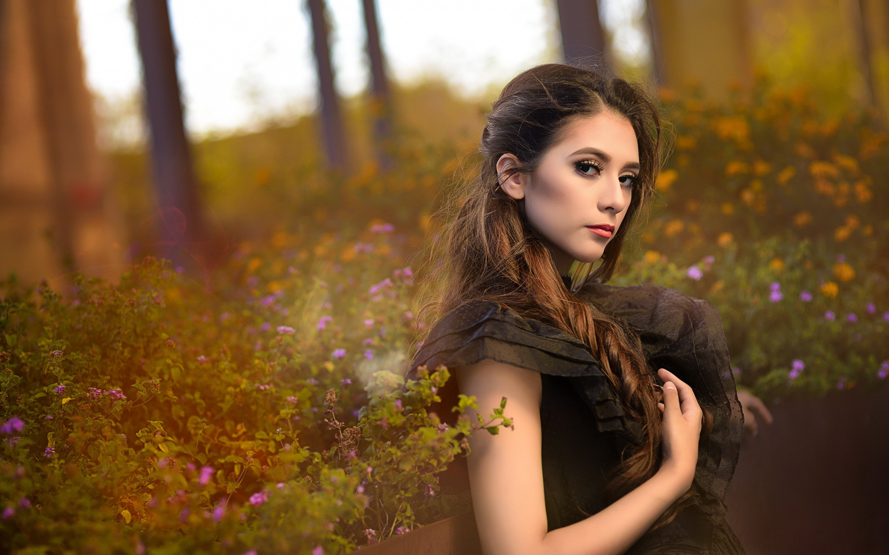 Description: A woman with long hair standing in a field of flowers and trees in the background is a forest with purple flowers.