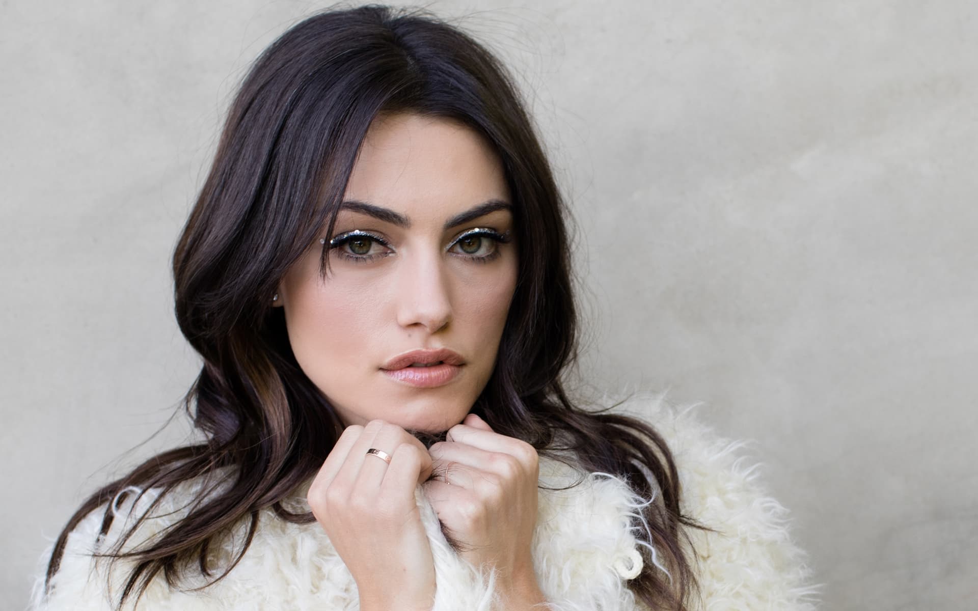 Description: A woman with long hair wearing a fur coat and a ring on her finger.