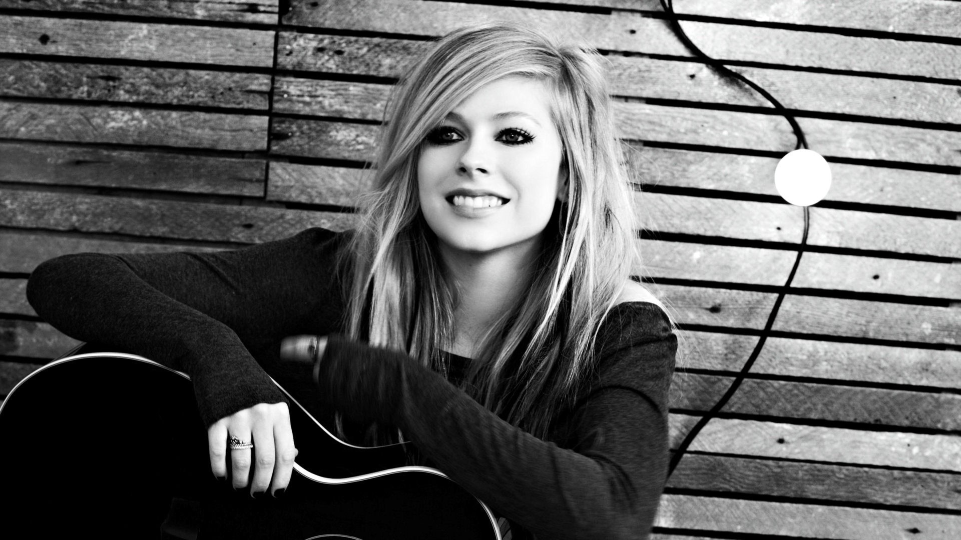 Description: A woman with long hair holding a guitar in front of a wall with a string of lights on it.