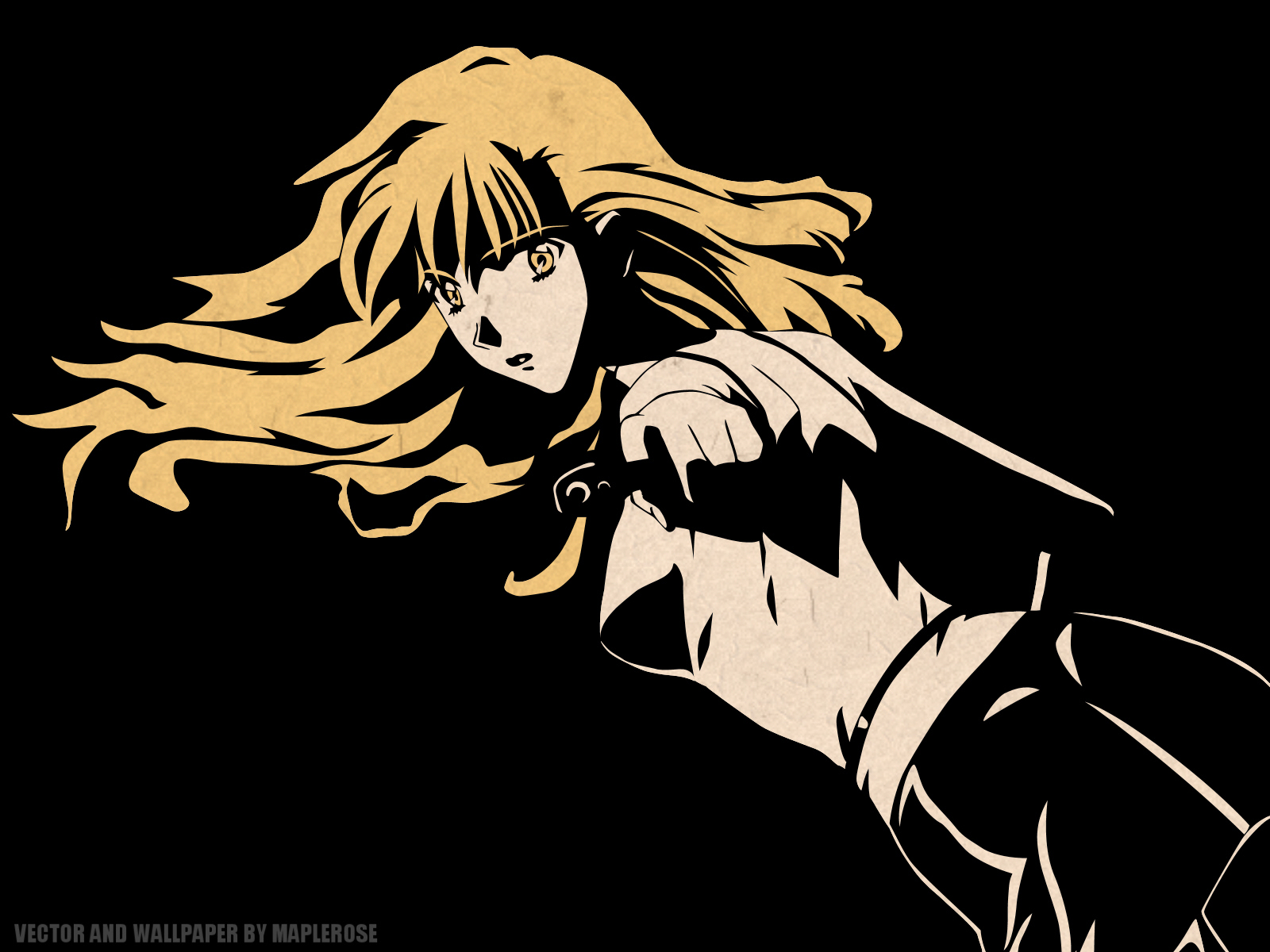 Description: A woman with long hair holding a knife in her hand and looking at the camera with a serious look on her face.
