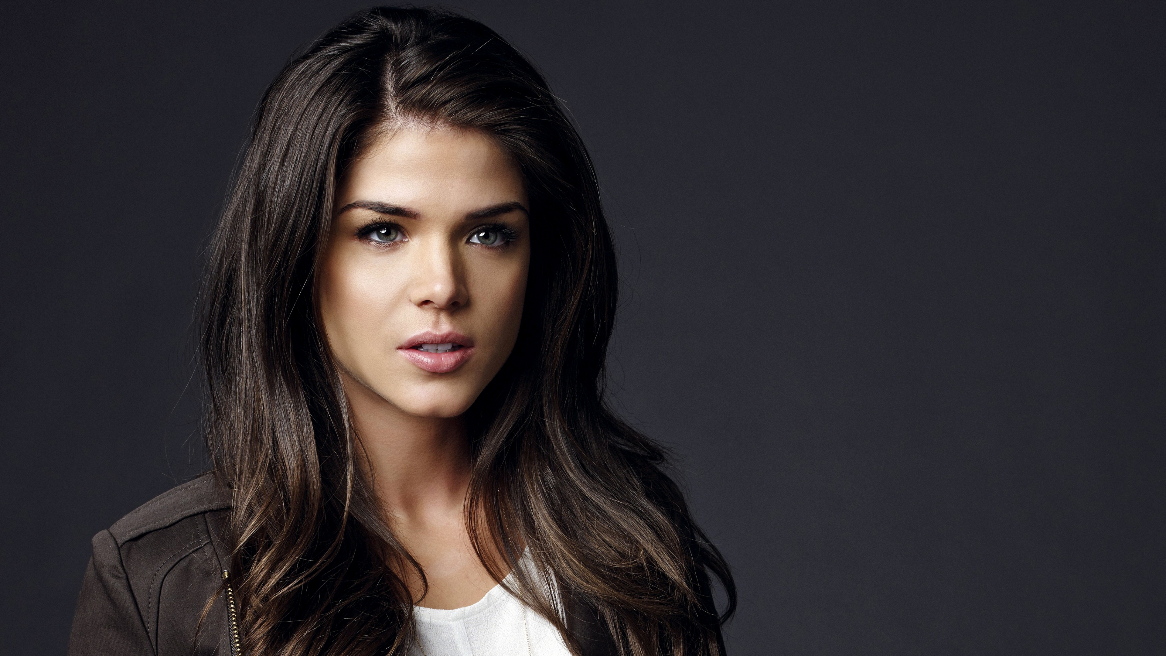 Description: A woman with long hair and a jacket on posing for a picture with a black background and a black background.