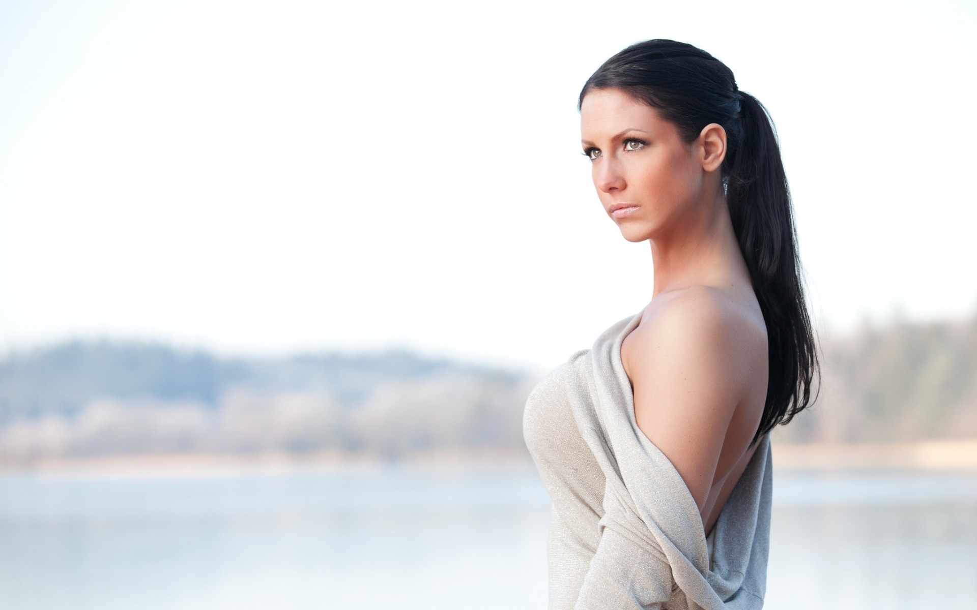 Description: A woman with a very long hair standing by a lake with her arms folded out and looking off to the side.