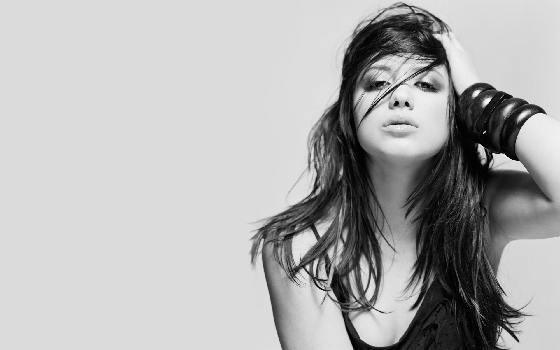 Description: A woman with long hair and leather gloves on her head is posing for a picture with her hands on her head.