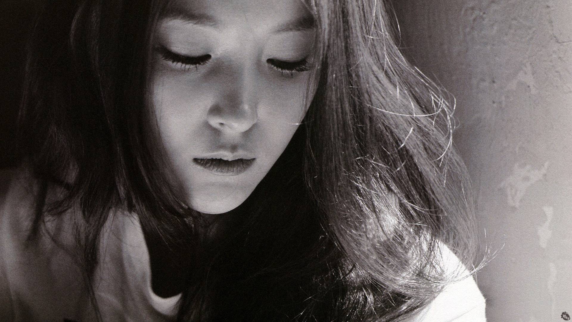 Description: A woman with long hair looking down at her cell phone while she is looking down at her phone screen.