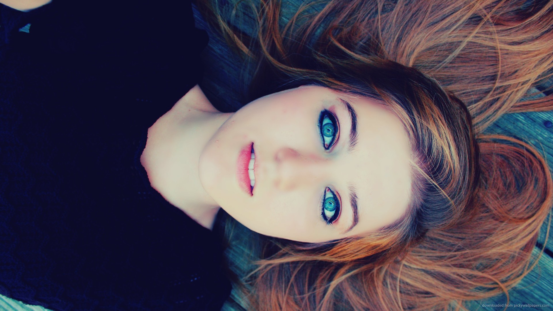 Description: A woman with long hair laying on a wooden floor with her eyes open and eyes wide open.