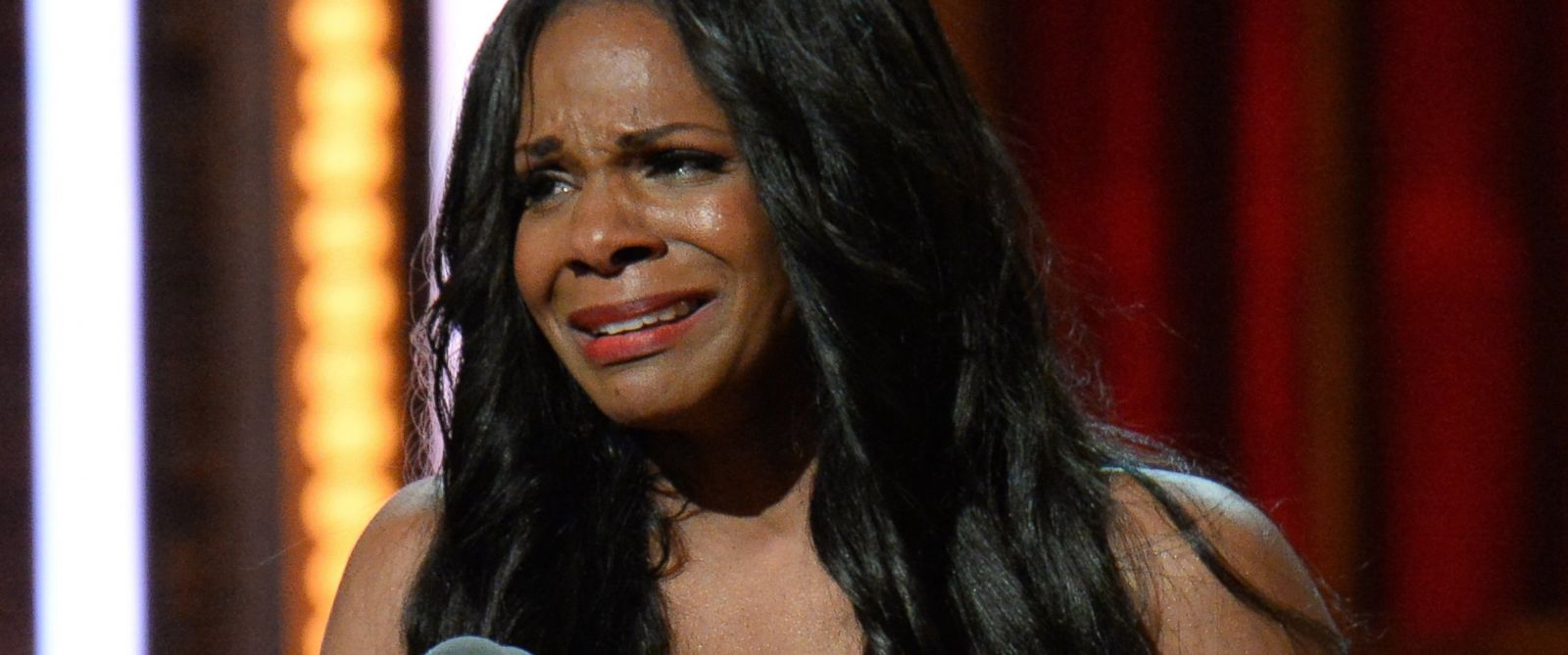 Description: A woman with long hair and a microphone in front of a curtain and a red curtain behind her is looking at the camera.