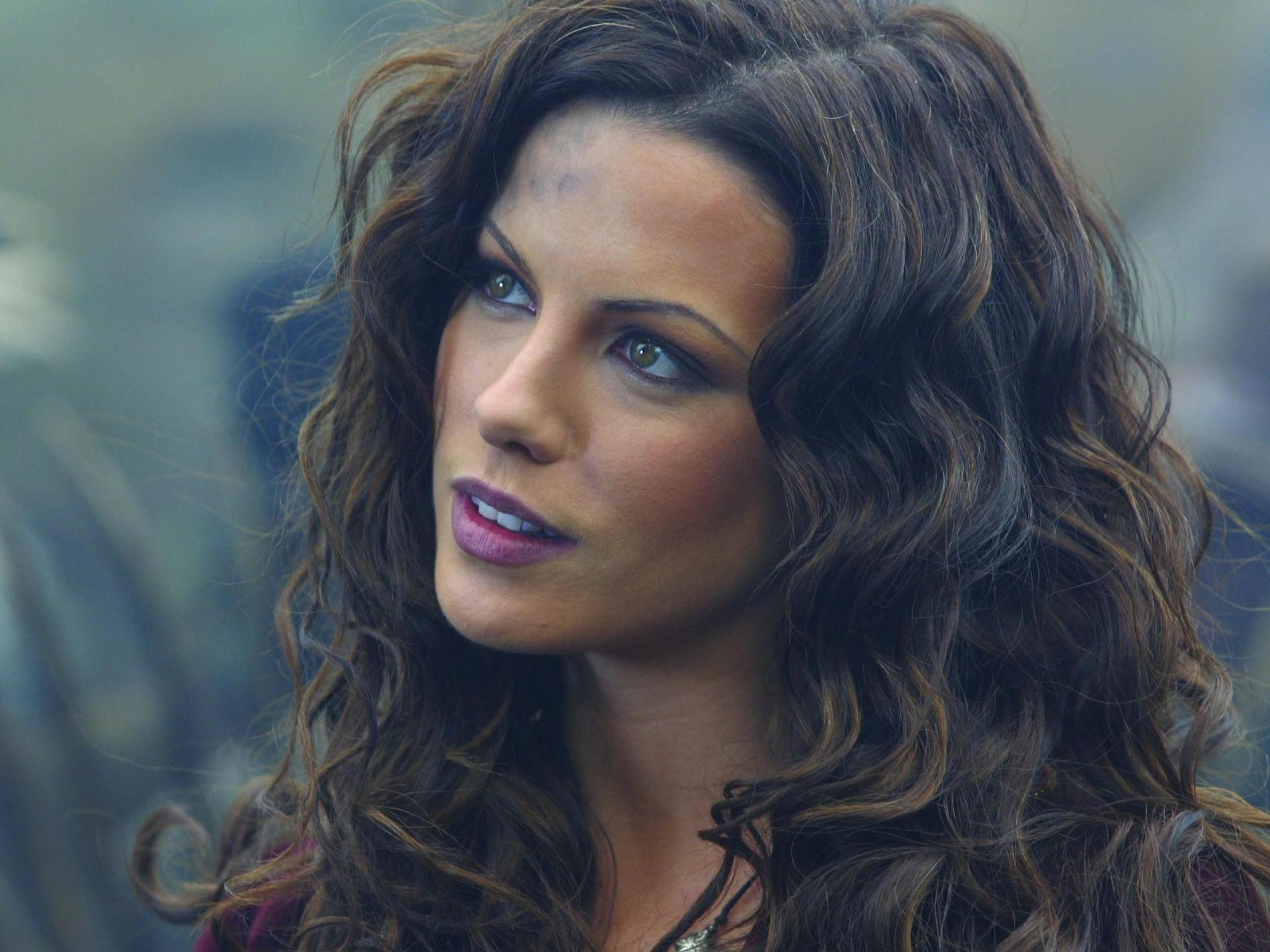 Description: A woman with long hair and a necklace on her neck looking off to the side with a serious look on her face.