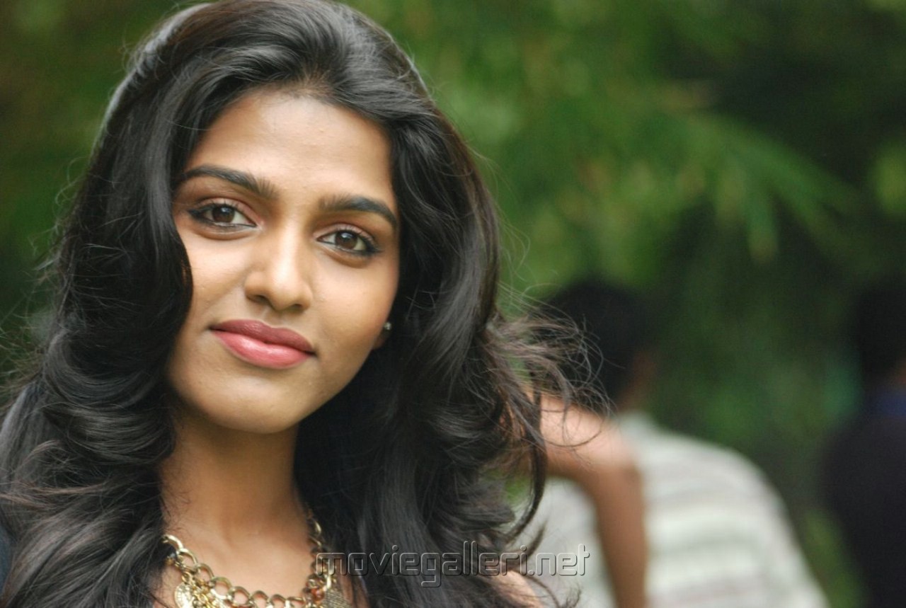 Description: A woman with long hair and a necklace on her neck and a tree in the background with people in the background.