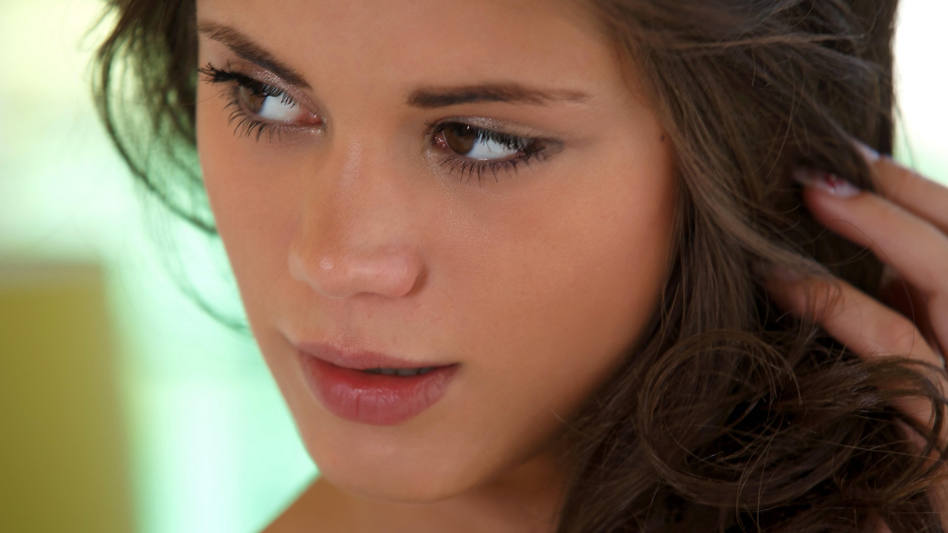 Description: A woman with long hair is looking at the camera and has her hand on her head and is touching her hair.
