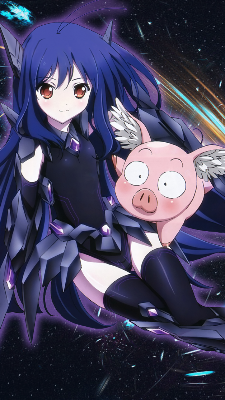 Description: A woman with long hair and a pig in her lap sitting on a floor in front of a star filled sky.