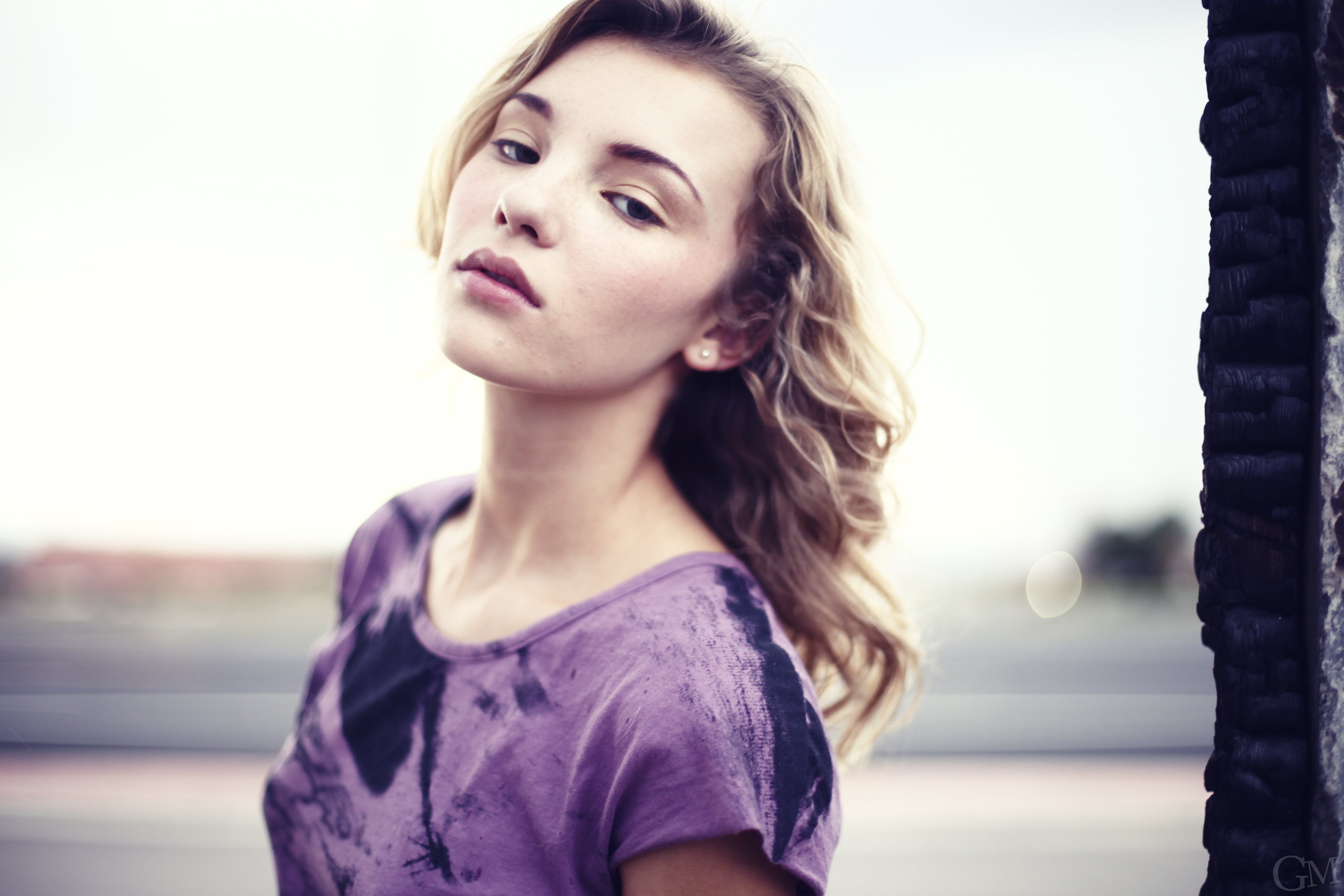 Description: A woman with long hair standing next to a pole and looking up at the sky with a serious look on her face.