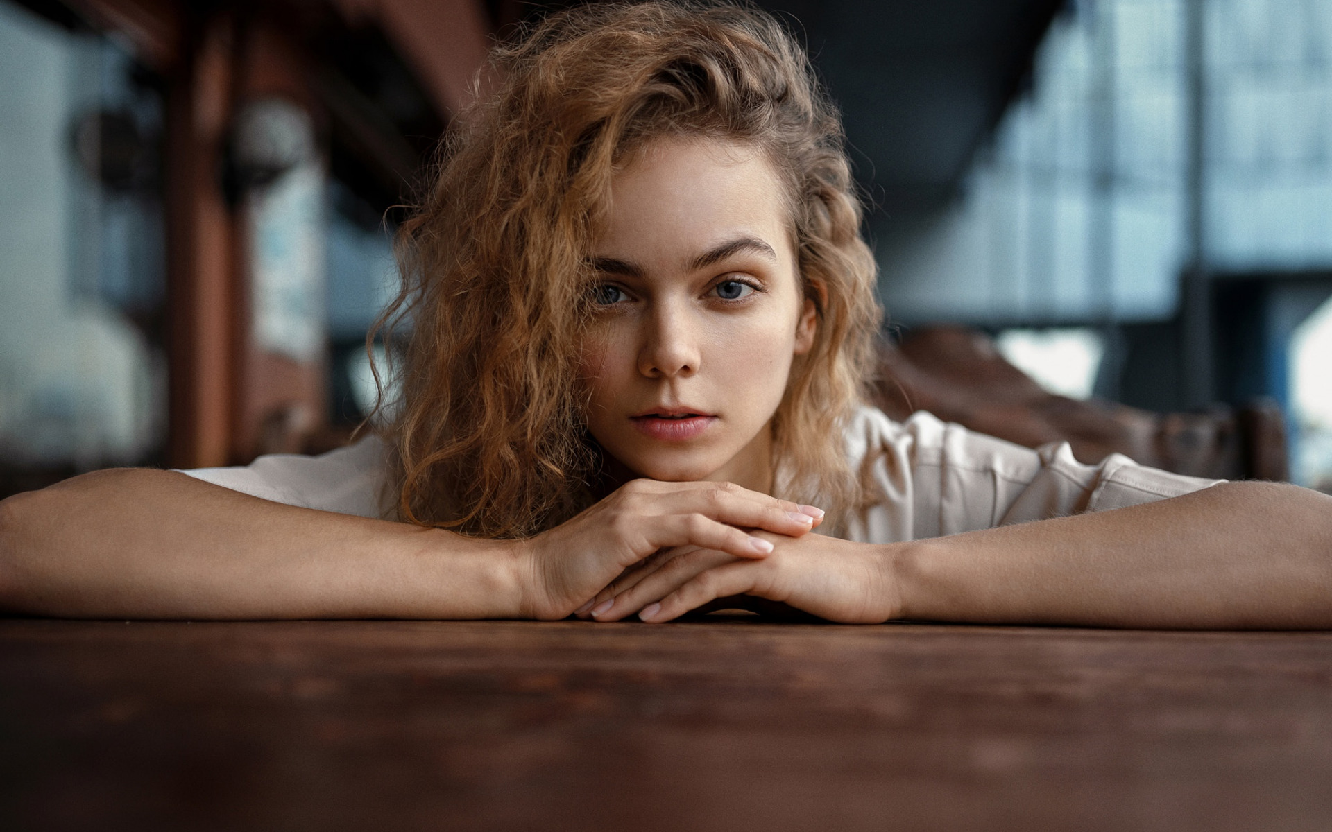 Description: A woman with long hair sitting at a table with her hands on her chest and looking at the camera.