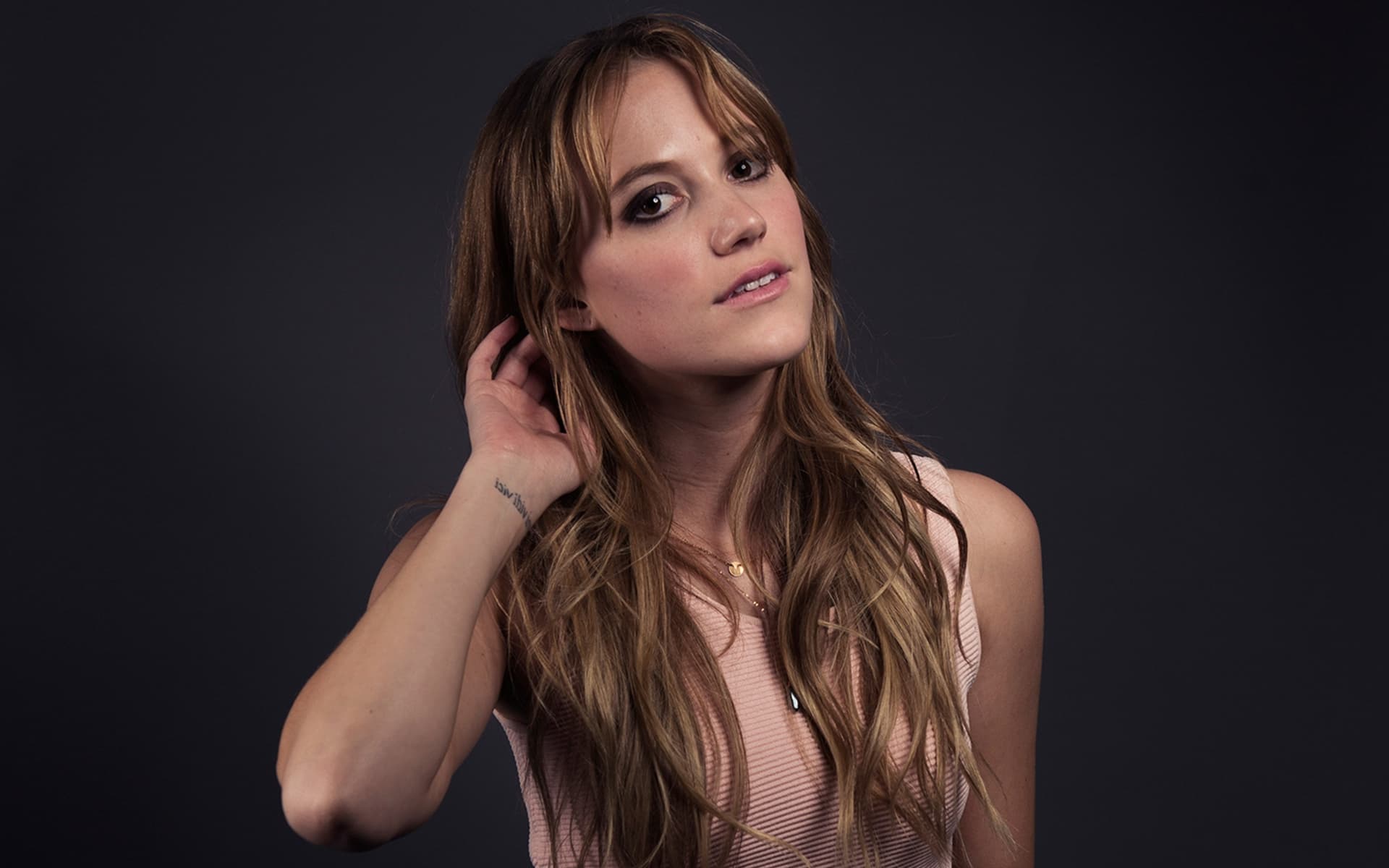Description: A woman with long hair is posing for a picture with her hand on her head and a necklace on her neck.