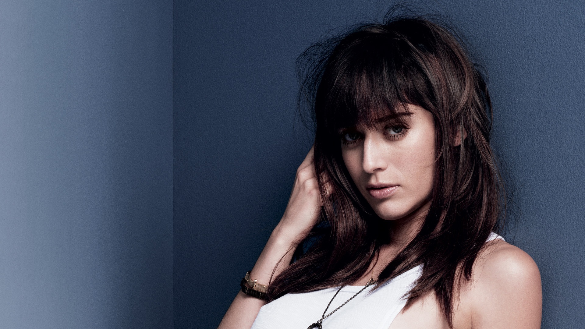Description: A woman with long hair posing for a picture with her hand on her head and a necklace on her neck.