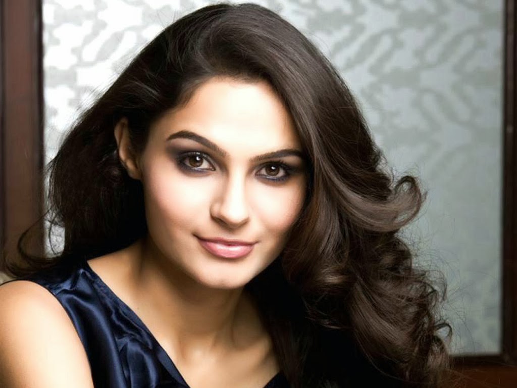 Description: A woman with long hair posing for a picture in a room with a mirror and a wallpapered wall.