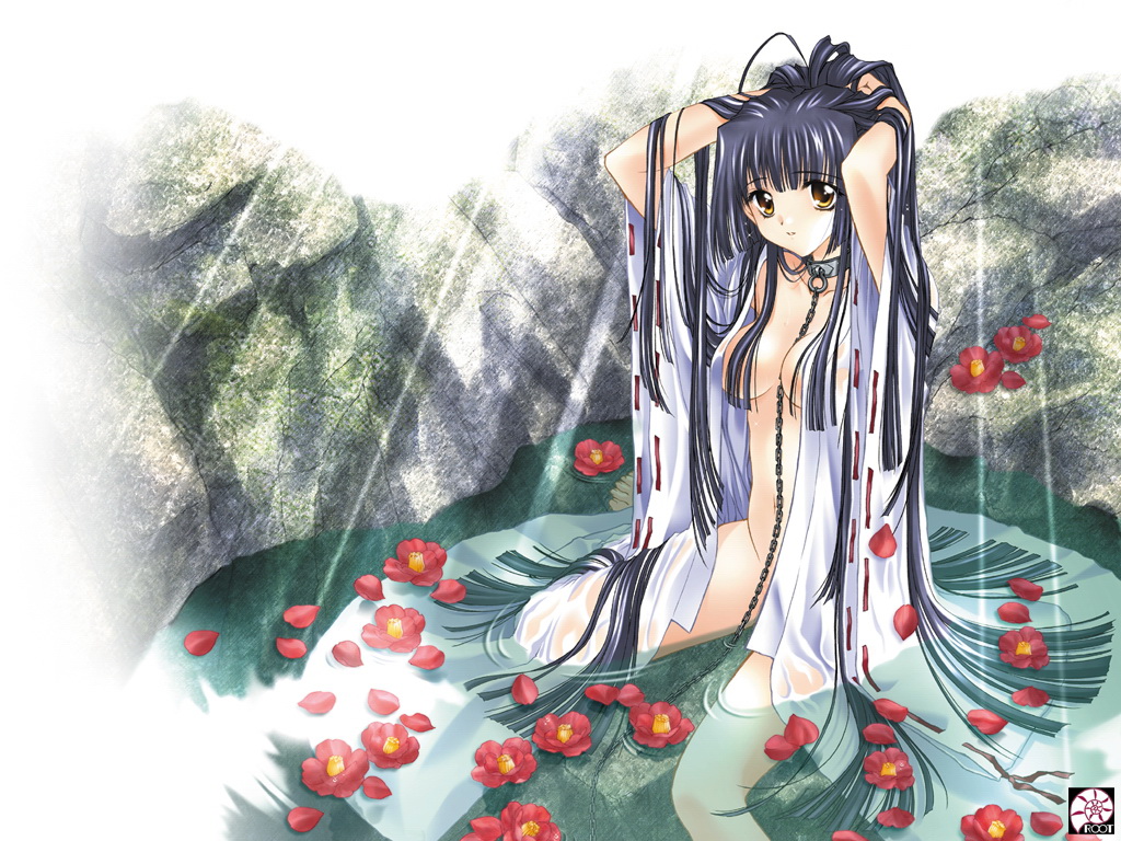 Description: A woman with long hair sitting on a rock in the rain with flowers around her and a waterfall in the background.