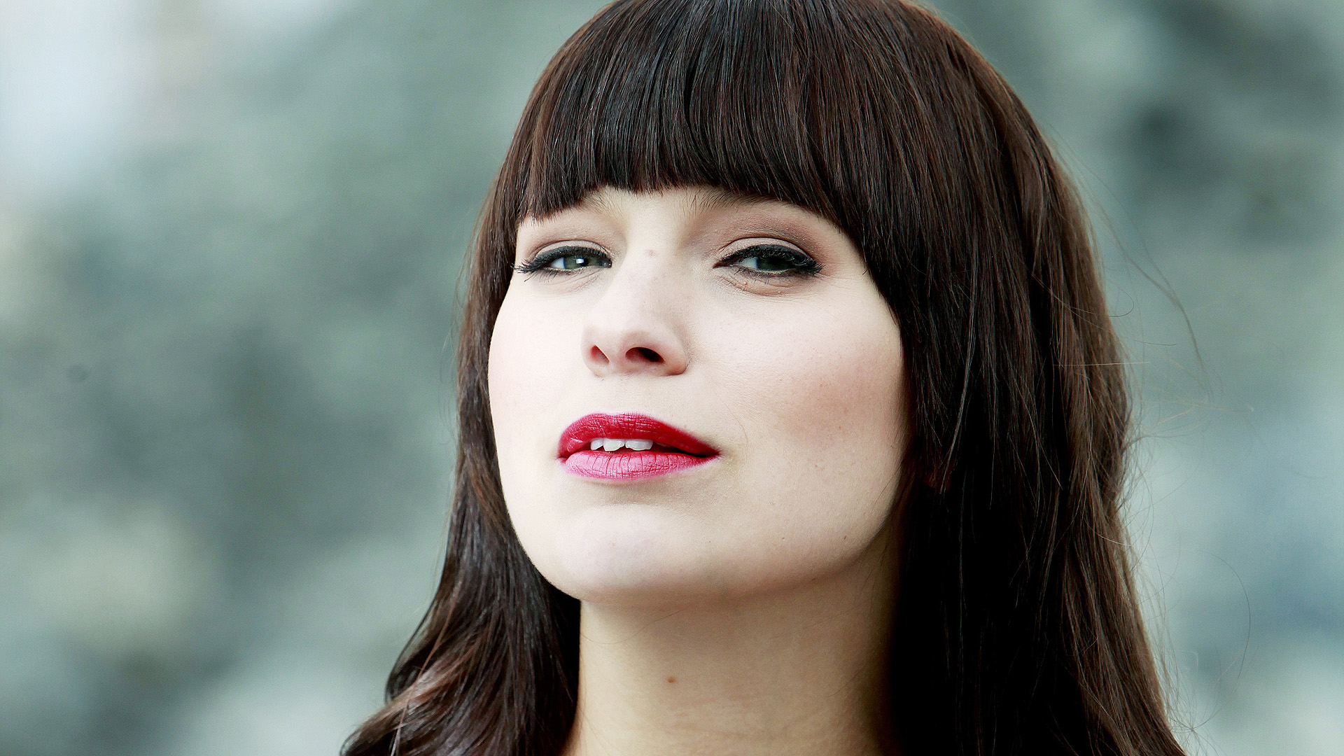 Description: A woman with long hair and a red lipstick looks up at the sky with her eyes closed and her hair in a fringe.