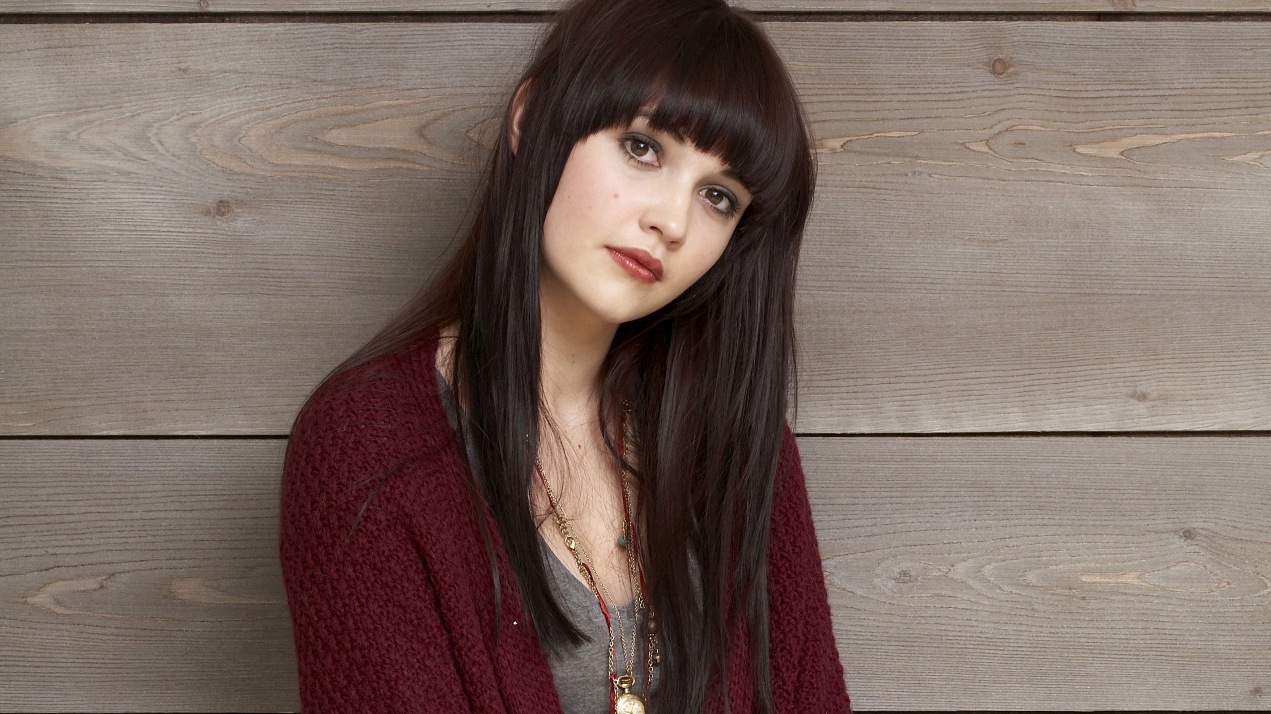 Description: A woman with long hair and a red sweater is posing for a picture in front of a wooden wall.