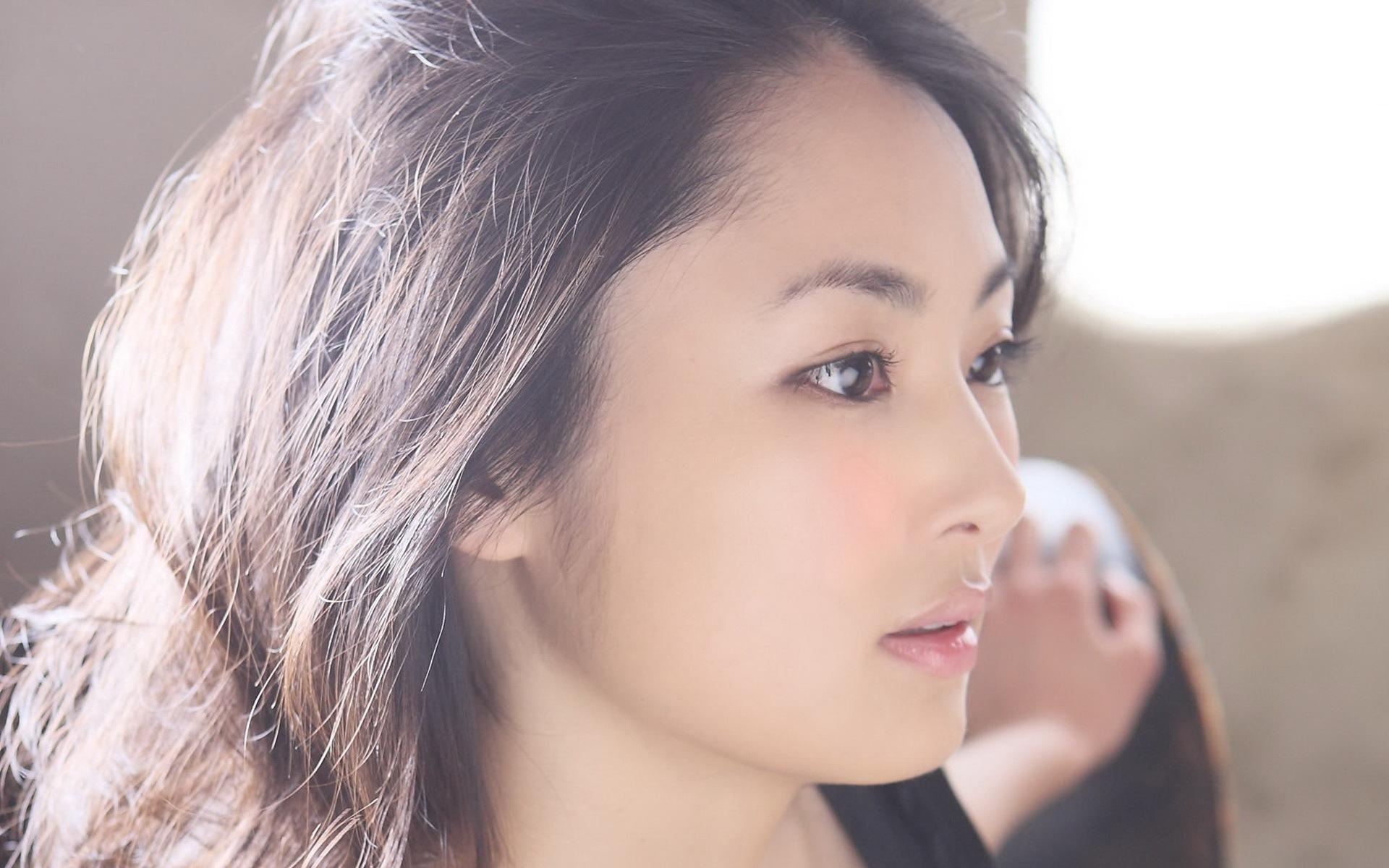 Description: A woman with long hair is looking at her reflection in a mirror and she is holding a cell phone.