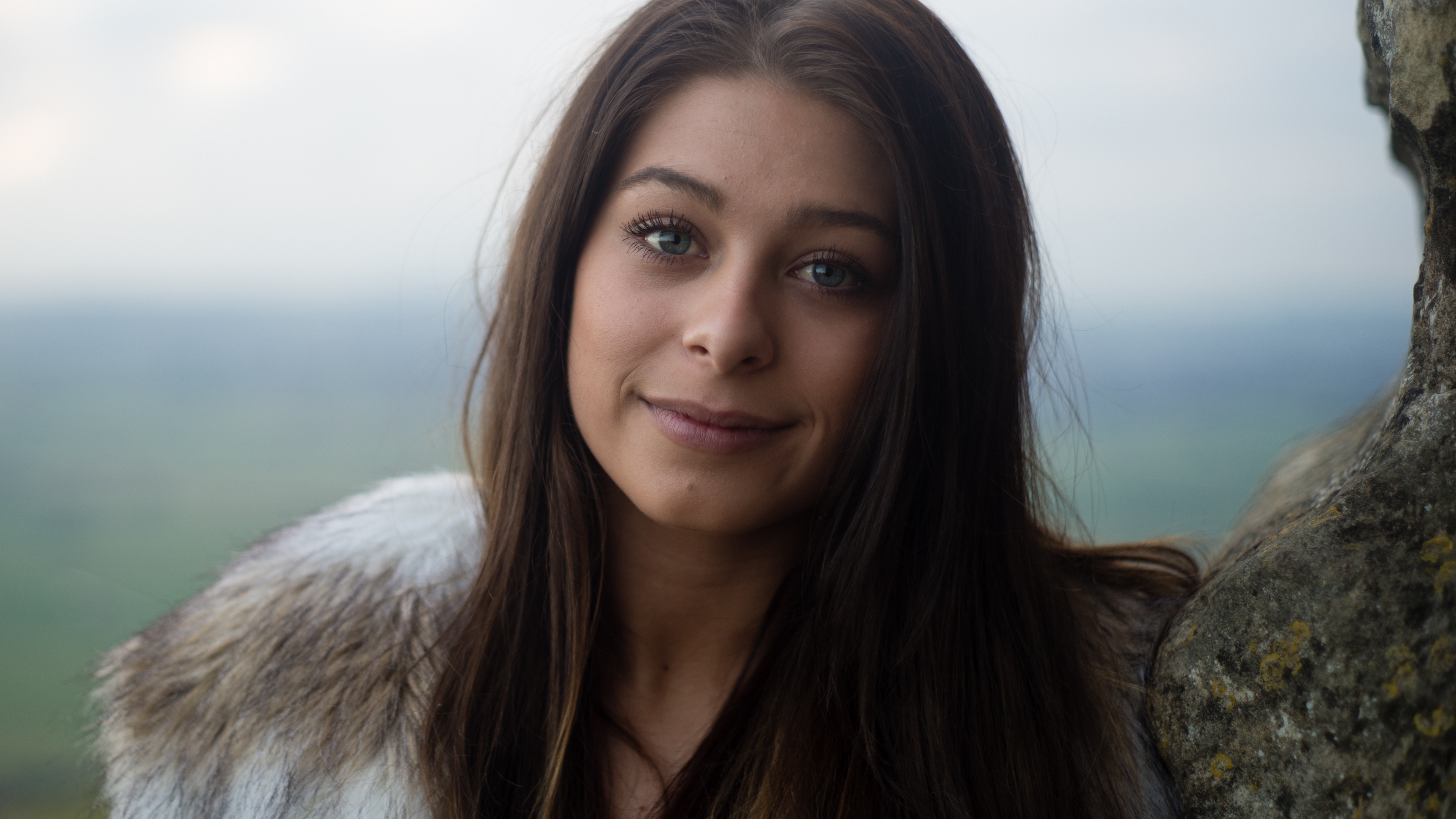Description: A woman with long hair standing next to a rock wall with a view of a valley in the distance.