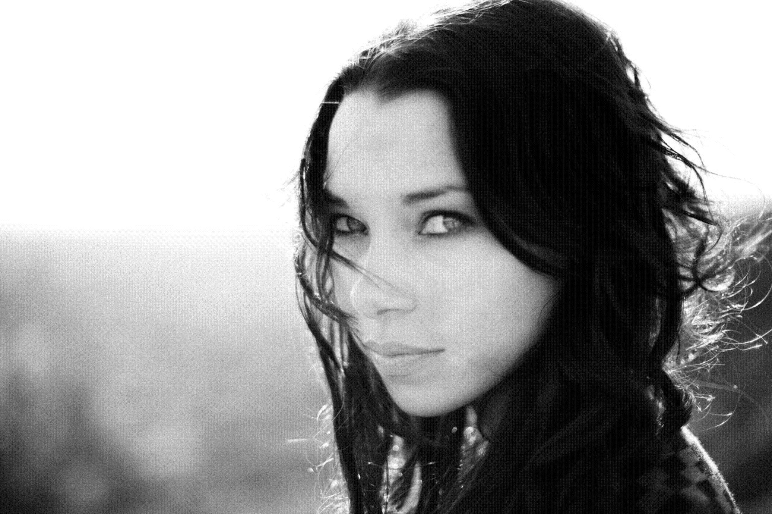 Description: A woman with long hair and a scarf on her head looking off into the distance with a mountain in the background.