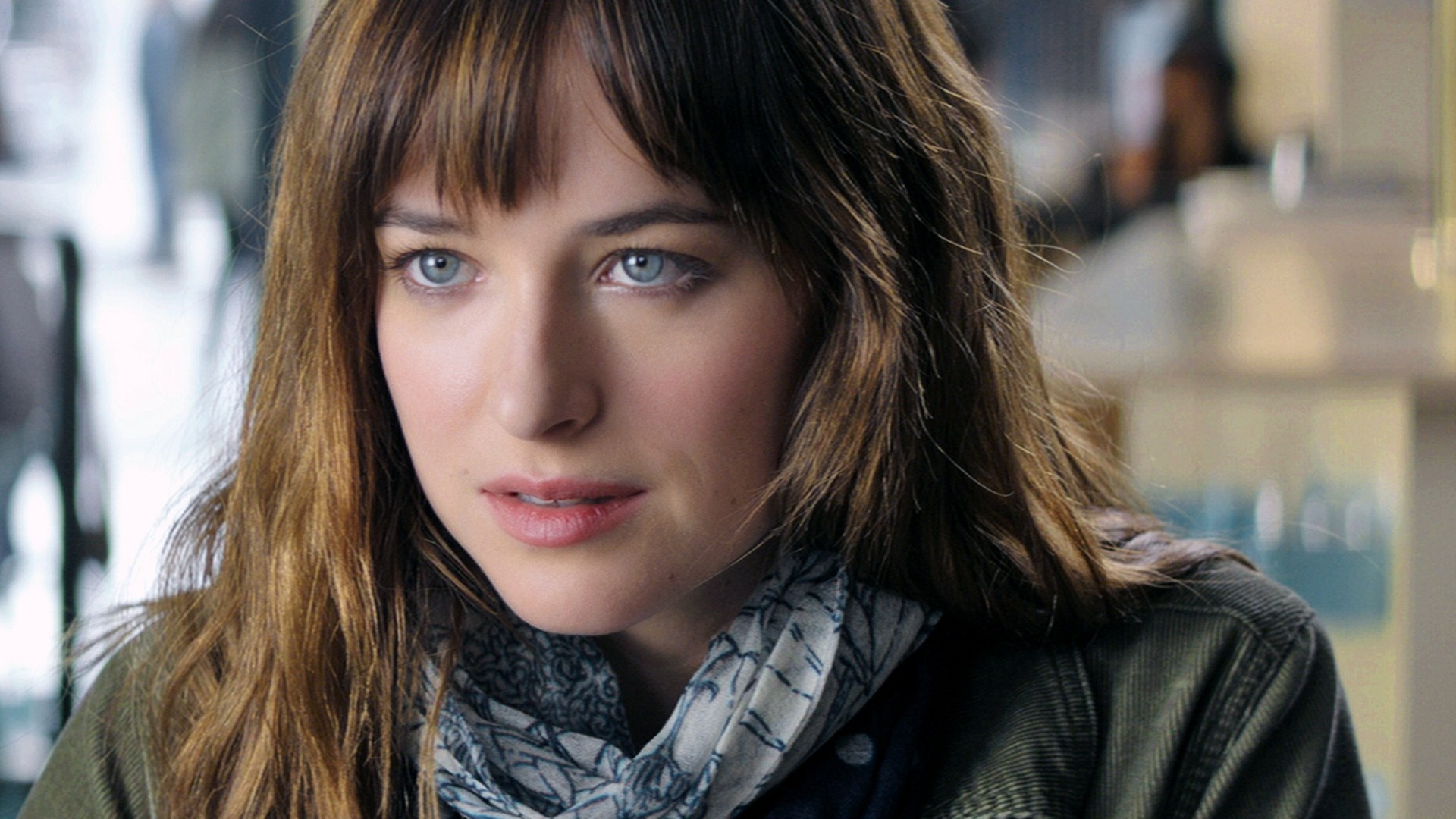 Description: A woman with long hair and a scarf around her neck looking at the camera with a serious look on her face.