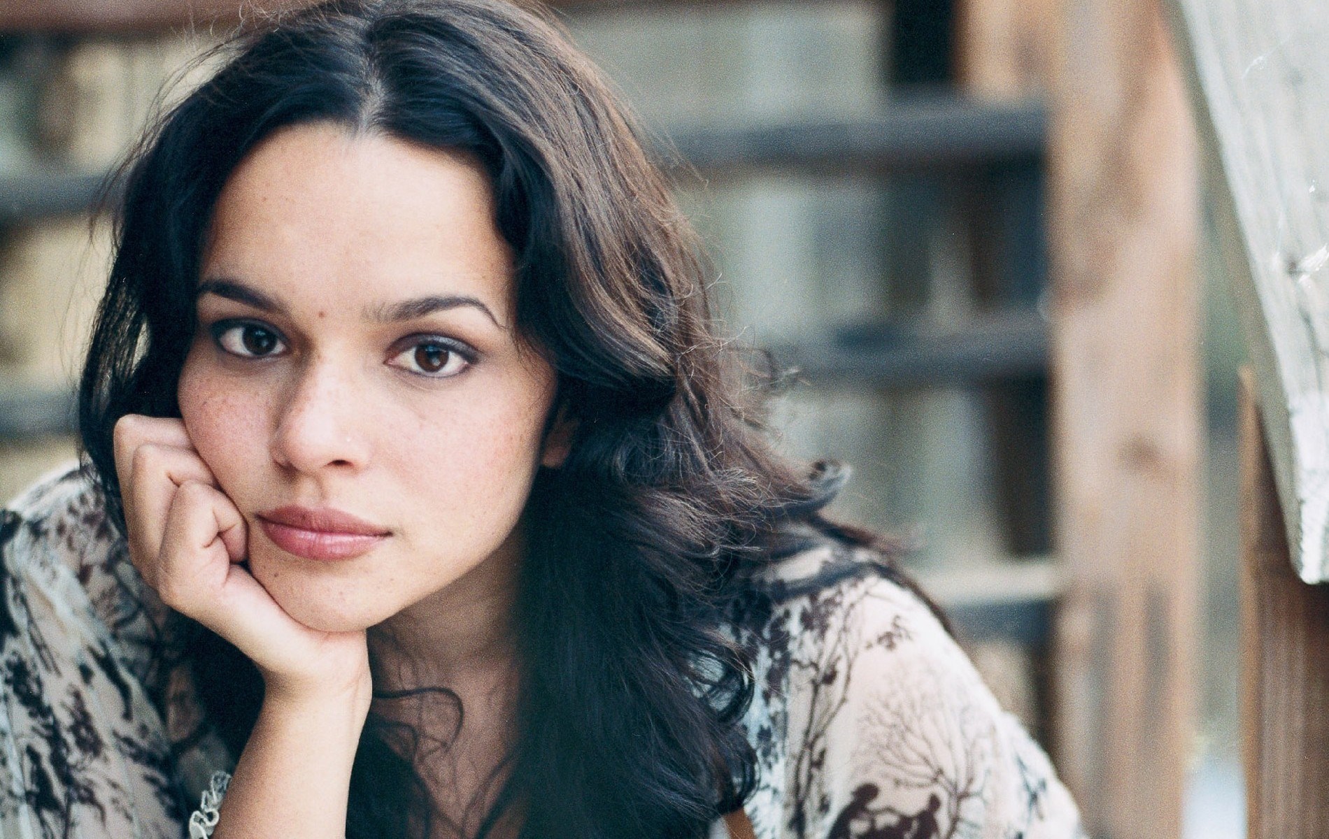 Description: A woman with long hair sitting down with her hand on her chin and looking at the camera with a serious look on her face.